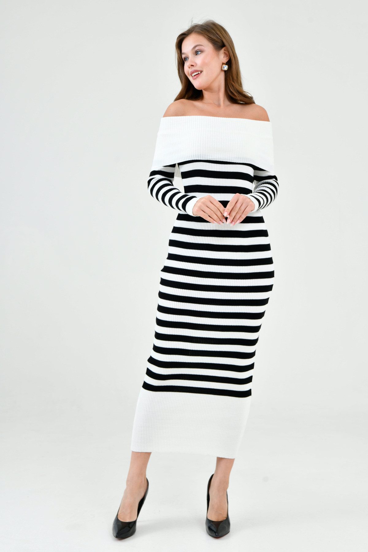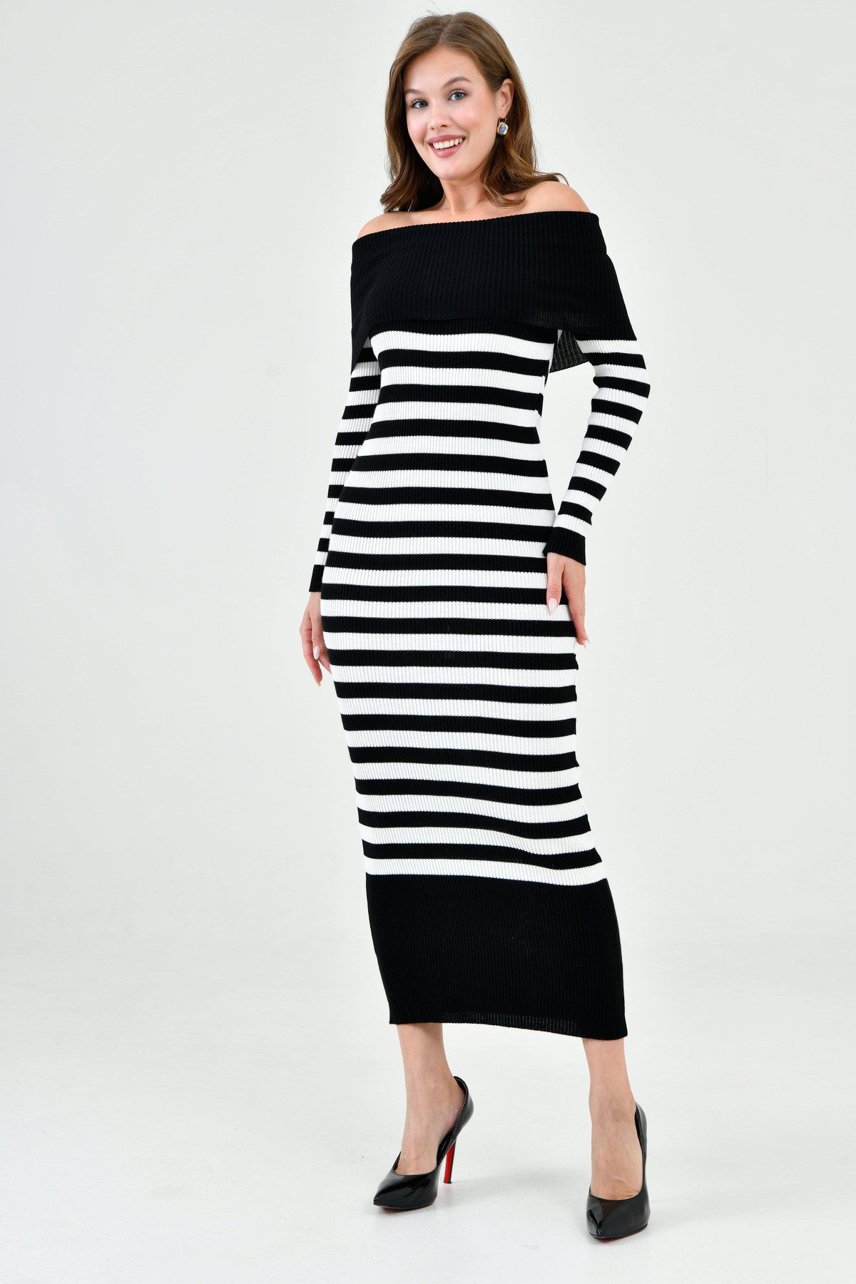 Schwarzes Strickkleid in Midilänge mit Bleistiftform, Madonna-Kragen, langen Ärmeln und Streifenmuster.; Aus flexiblem Strickstoff.; ; ES IST UNGEFÜTTERT.; ; ES IST NICHT GEPOLSTERT.; ; Размер des Models: 173 cm Gewicht des Models: 55 Produkt auf Schaufensterpuppe STANDARD 36/38 Produktlänge: 120 cm Ärmellänge 50/52 cm (Kann um 1–3 cm variieren.; ) Stoffart: Gestrickter Strickstoff Stoffinhalt: 100 % Acryl Hinweis: FRAGE/ANTWORT: UM UNTERSTÜTZUNG BEI DER AUSWAHL DER RICHTIGEN GRÖSSE ZU ERHALTEN, KÖNNEN SIE UNS IM FRAGE-/ANTWORT-BEREICH ALLE FRAGEN TEILEN, DIE SIE HABEN.; - Das langärmlige Strickkleid, das mit seinem Madonna-Kragendesign Eleganz und Anmut vereint, sorgt in jeder Umgebung für einen auffälligen Look.; - Während es mit seinen Schlitzdetails eine moderne und dynamische Silhouette kreiert, ist sein Midi-Schnitt ideal für den Alltag und besondere Anlässe.; - Dieses Kleid bietet mit seiner taschenlosen Struktur einen minimalistischen Stil und kombiniert dank seines offenen Designs Komfort und Eleganz.; - Es bietet mit seiner mitteldicken Strickstruktur idealen Komfort, den Sie während des Saisonwechsels wählen können.; - Dieses Kleid bietet mit seiner ungefütterten Struktur Komfort und mit seinem geraden Schnitt einen schlichten und zeitlosen Stil.; - Dieses als Teil der Fashion Forward-Kollektion entworfene Stück wird seinen Platz in der Garderobe stilbewusster Frauen einnehmen, die den Trends folgen.; - Mit seiner figurbetonten Silhouette schmiegt es sich sanft an die Körperlinien und zeigt eine feminine Haltung.; - Dieses Kleid ist mit seiner unbedruckten Struktur die Wahl, die schlicht bevorzugt, und lässt sich mit seinem schlichten Muster leicht kombinieren.; - Mit seiner strickähnlichen Textur fühlt es sich weich an und erhöht die Haltbarkeit.; - Mit seinen Эко-товарыsdetails ist es ideal für Sie, um bei Ihren umweltfreundlichen Entscheidungen etwas zu bewirken; Es gibt keine zusätzlichen Funktionen.; - Die Hergestellt in der Türkei. 8685030005168