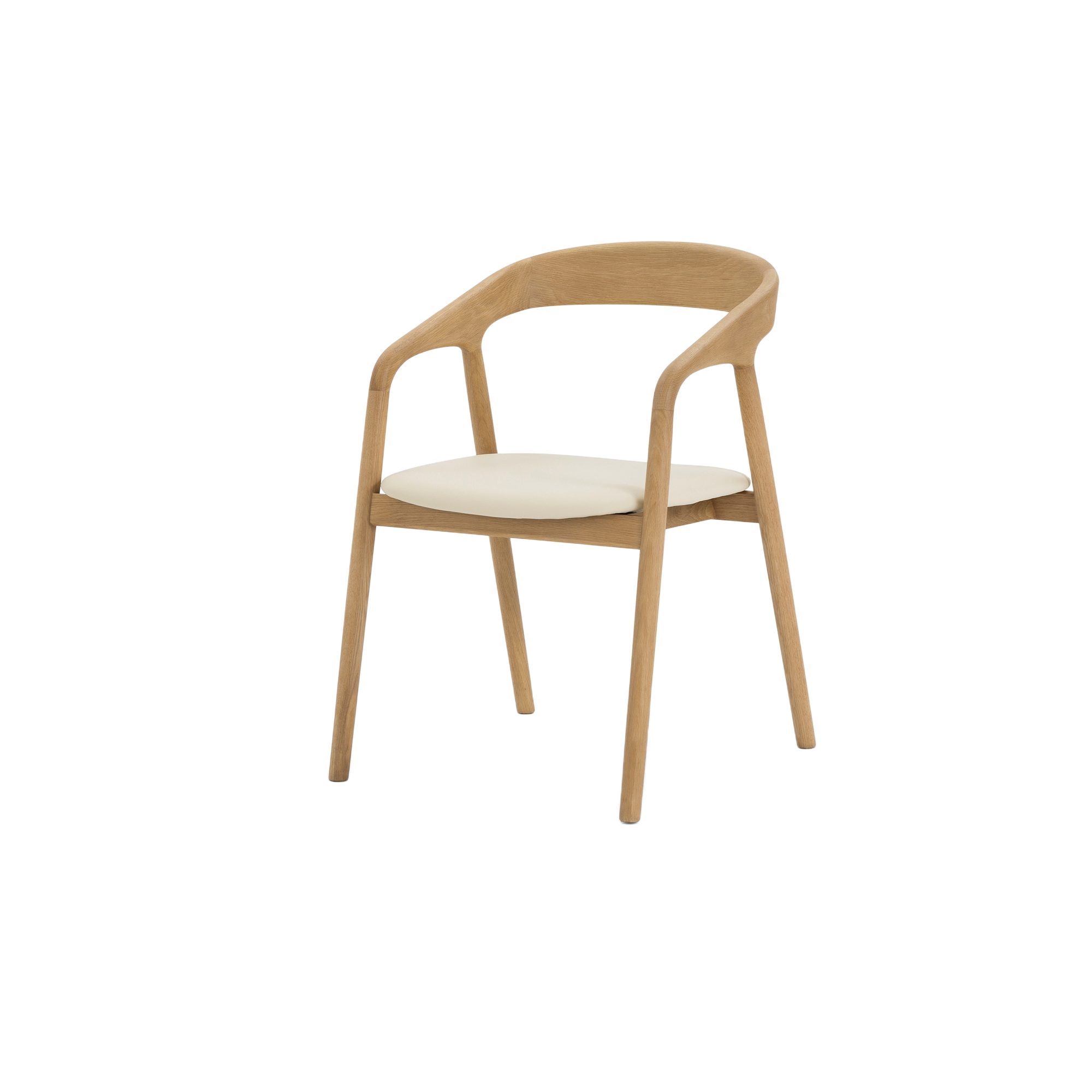 Der Armlehnenstuhl Celeste bringt mit seiner Mischung aus massiver Eiche und sandfarbenem Veganleder eleganten Komfort an Ihren Esstisch. Die weich geschliffenen Armlehnen gehen nahtlos in das Untergestell über und zeigen, wie viel Handwerkskunst in jedem Detail steckt. Eine seidenmatte Lackierung schützt das Holz und lässt die Maserung sanft durchscheinen.