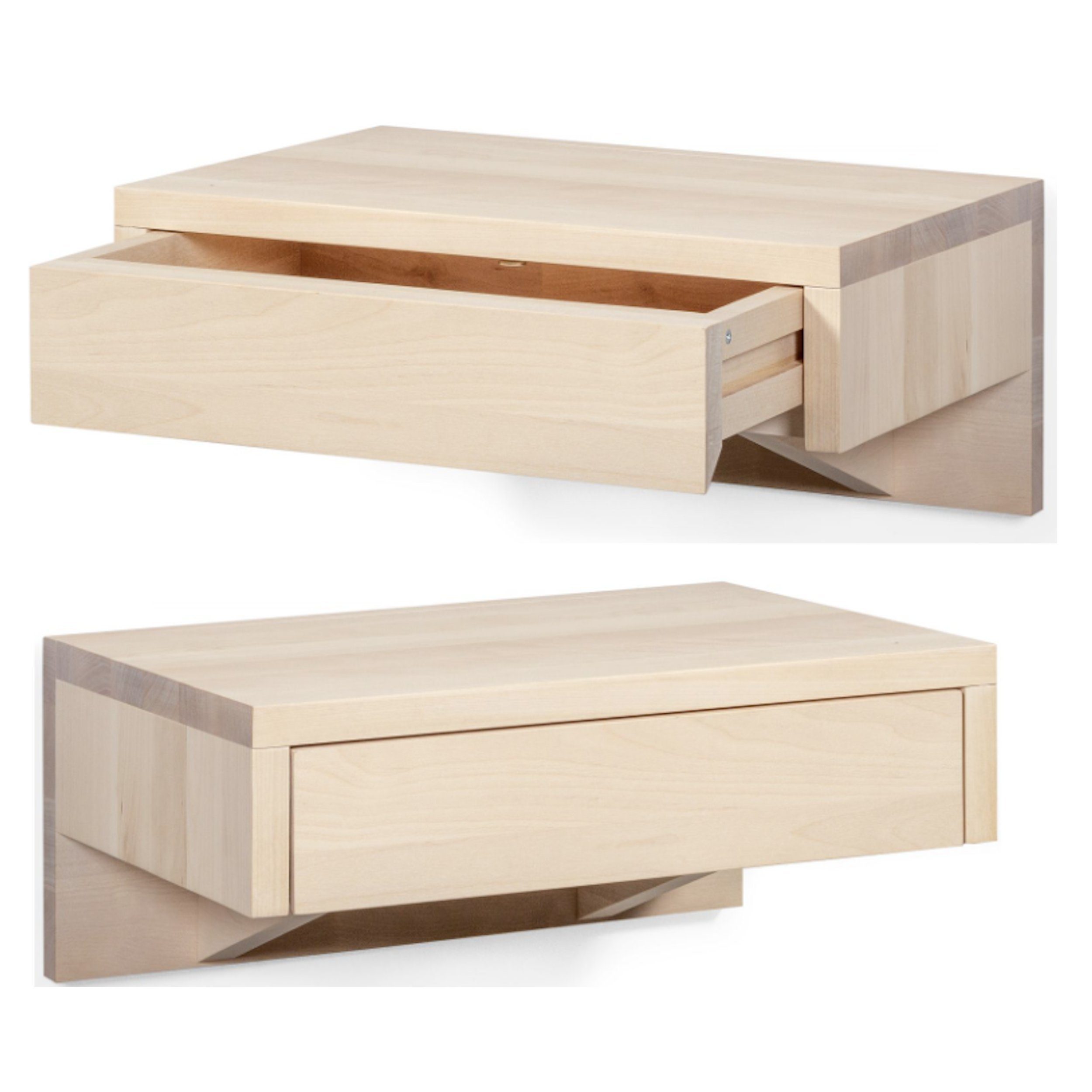 Im Gegensatz zu herkömmlichen Nachtschränken, die Bodenfläche einnehmen, werden unsere Nachttische an der Wand montiert und schaffen dadurch mehr Platz im Raum. Die Beistelltische bestehen aus weißer Buche, die ihnen eine elegante Optik und Haltbarkeit verleiht. Dank ihrer robusten Konstruktion sind diese Nachtkonsolen langlebig und für den täglichen Gebrauch ausgelegt.