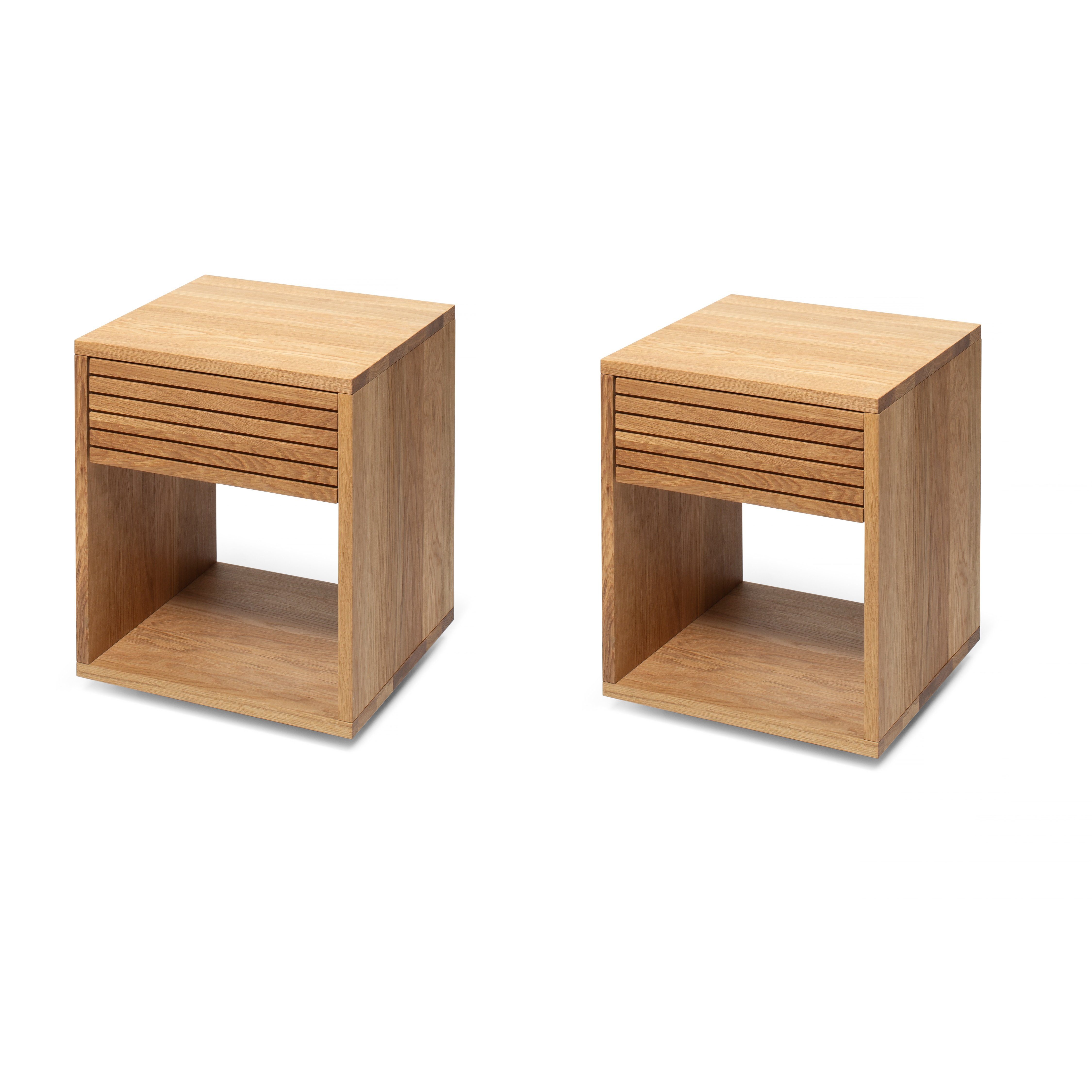 Geben Sie Ihrem Schlafzimmer mit dem 2er-Set Nachttisch "Emma" in geölter Eiche von Woodek Design den letzten Schliff. Hergestellt aus Eichenholz, stehen diese Nachtschränke für Langlebigkeit und Stil.