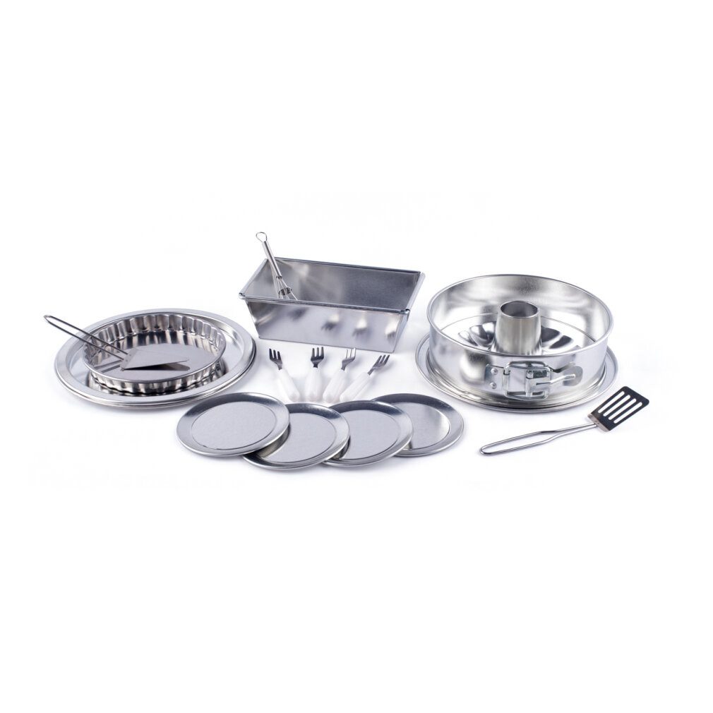 Das Backset aus Edelstahl für Kinder kann zum echten Backen im Ofen verwendet werden. So können die Kinder ihre eigene Babovka, ihren eigenen Kuchen oder ihr eigenes Keksbrot herstellen. Servierteller und Gabeln sind ebenfalls erhältlich. Dieses Set besteht aus 16 Teilen. Alter: 3+ | Durchmesser der Babka: 16 cm