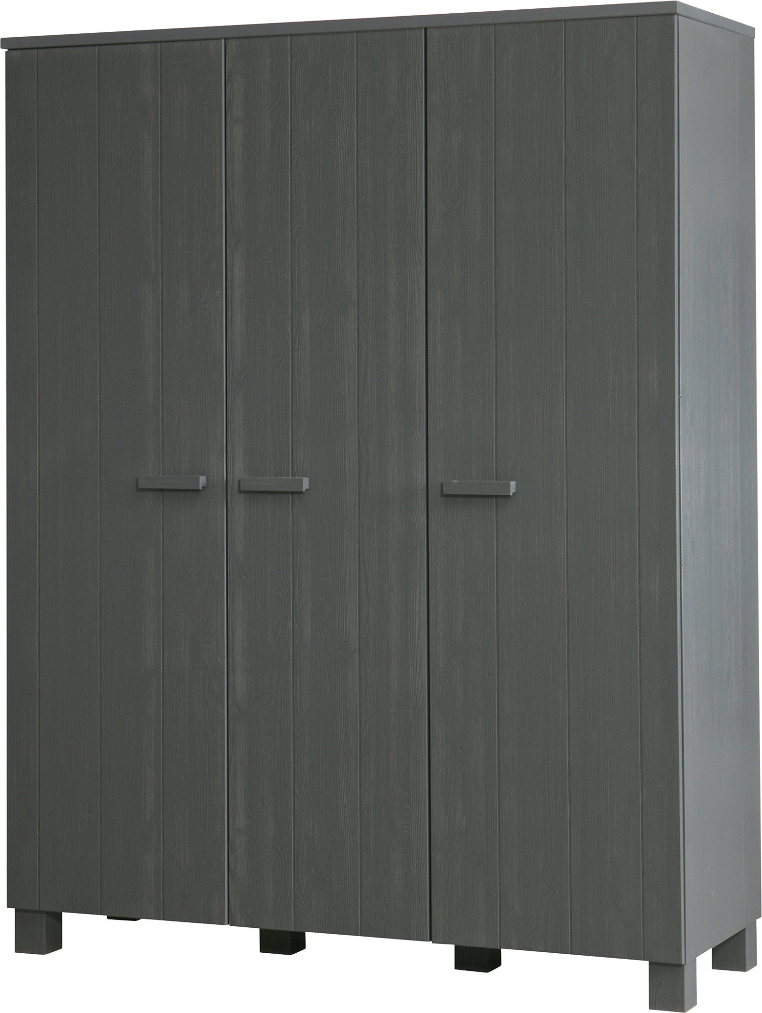Ergänzende Informationen | Dreitüriger Schrank Dennis (hxbxd): 202x158x55 cm ist eine Eigenproduktion der niederländischen Marke WOOOD. Dieser Schrank ist ein Hänge-/Schrankschrank mit Drehtüren und gehört zur Dennis-Serie. Das Innere des Schrankes besteht aus (Hängeteil) einem breiten Regal von 100 cm mit unter einer Stange und (Verlegeteil) 4 Regalen von 53 cm Breite. Die Türen mit Holztürknopf haben massive Metallscharniere. Der Schrank besteht aus FSC-zertifizierter Kiefer, ist in der Farbe stahlgrau lackiert und gebürstet. Beim Bürsten von Kiefernmöbeln wird die Maserung des Holzes stark betont, wodurch eine gealterte Oberfläche entsteht. Die Dennis-Serie ist in zwei Grautönen erhältlich: Betongrau und Stahlgrau. In der Dennis-Serie sind folgende Artikel erhältlich: 2-türiger Kleiderschrank, Bett in drei Ausführungen, Aufbewahrungs-/Matratzenschublade, Nachttresor, Schreibtisch, Schubladenschrank, Aufbewahrungs-/Spielzeugbox und Wandregal mit 2 Schubladen in den Farben betongrau und stahlgrau. Der Schrank wird als Bausatz geliefert und ist mit Hilfe der mitgelieferten Montageanleitung einfach zu montieren.Dieser dreitürige Schrank Dennis hat ein Gewicht von 96,6 kg. |