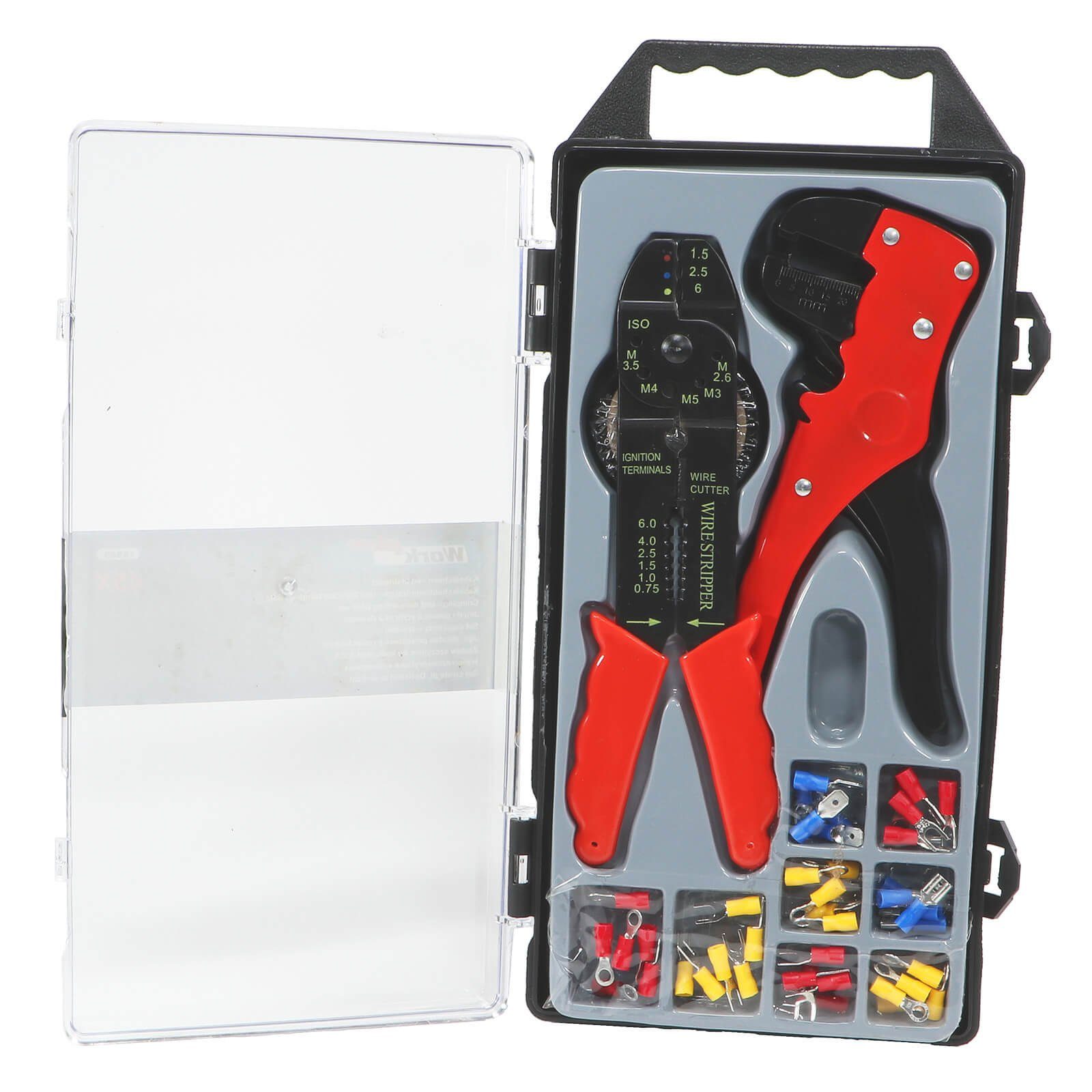 Automatik Abisolierzange, Kabelschuh Presszange, Isolierband und Kabelschuhe in verschiedenen Sorten (Ringkabelschuhe, Gabelkabelschuhe, Flachstecker, Flachsteckhülsen)
