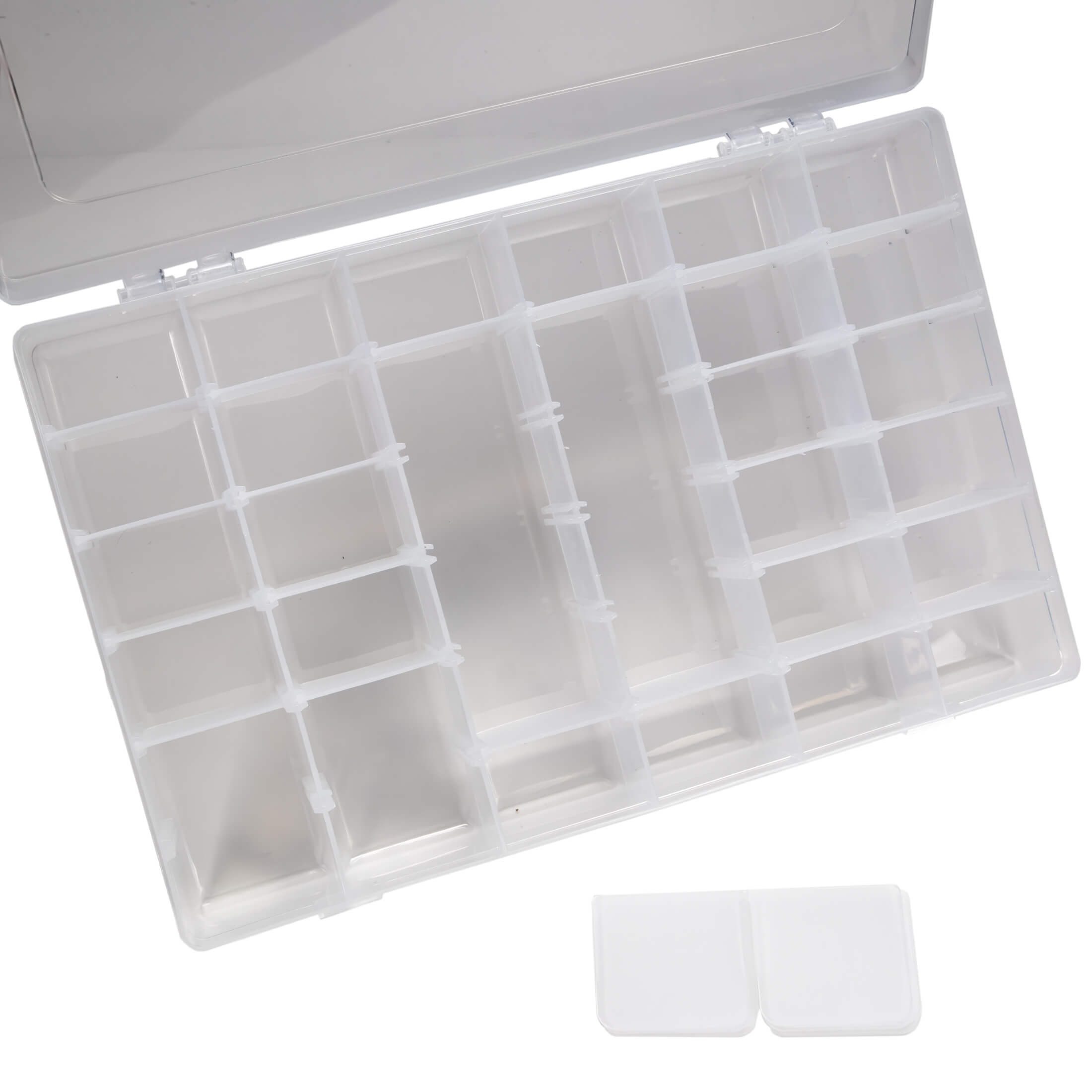 Sie möchten Ihre Bastelutensilien oder Schmuckstücke ordentlich und übersichtlich aufbewahren? Dann ist die transparente Sortierbox mit 36 Fächern genau das Richtige für Sie. Die verstellbaren Trennwände ermöglichen es Ihnen, die Размер der Fächer individuell anzupassen, um unterschiedliche Gegenstände zu sortieren. Die Box aus stabilem Kunststoff hat die Abmessungen 27,5cm x 18cm x 4,3cm und passt somit perfekt auf Ihren Schreibtisch oder in die Schublade. Durch die transparente Oberfläche behalten Sie stets den Überblick über den Inhalt.