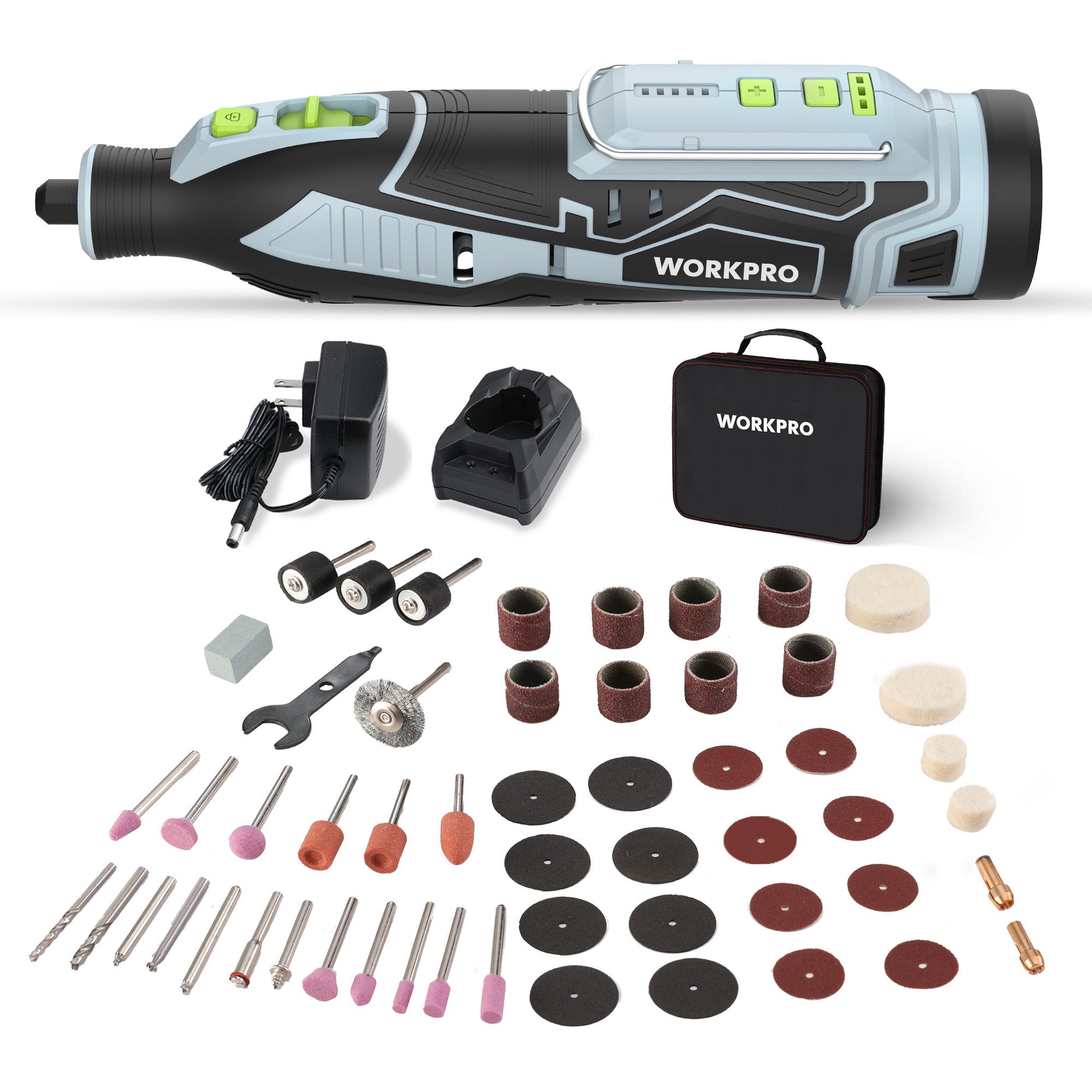 Das 12V Drehwerkzeug Set von WORKPRO kommt mit 115 Zubehörteilen und 5 Geschwindigkeiten.