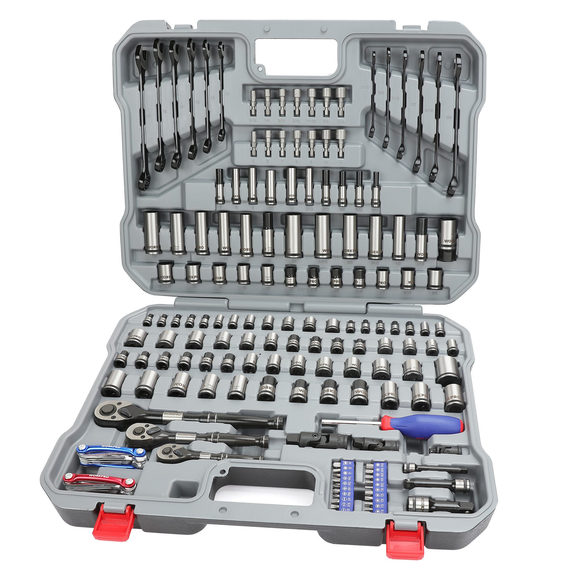 Der 164-teilige WORKPRO Werkzeugkoffer enthält eine Vielzahl an nützlichen Werkzeugen wie Schraubenschlüssel, Ratschengriff und Innensechskantschlüssel.