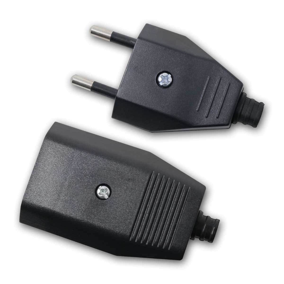 Set Europa-Kupplung & Stecker, Schraubanschluss, für schutzisolierte Geräte mit Leitungen 2×0,75mm², nur für Innenbereich - Material: Kunststoff (Polycarbonat) - Farbe: schwarz - Steckrichtung gerade - für Leitungen mit 2×0,75mm² - Spannung: 250V/16A - Strom: 2,5A - Anschlüsse über Schraubklemmen - mit Zugentlastung - Maße Stecker: ca. 60x35x15mm (LxBxH, mit Stecker) - Maße Kupplung: ca. 60x40x19mm (LxBxH) - Schutzklasse: IP20 - alle Angaben laut Hersteller