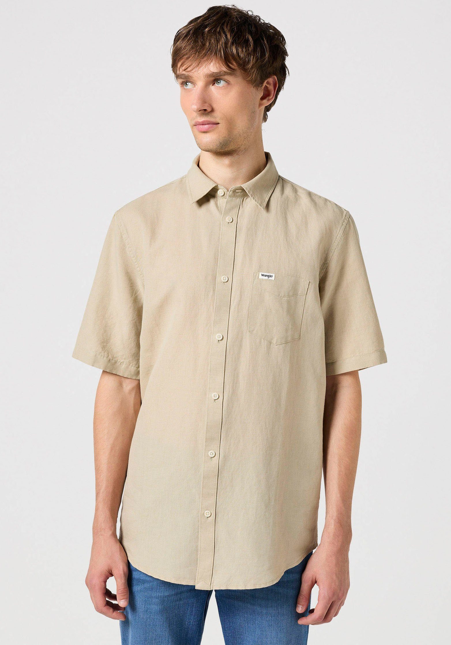 Das Kurzarmhemd von Wrangler ist sowohl bei schicken Anlässen als auch im Büro eine gute Option. Der Kentkragen hat eine etwas breitere Kragenstellung, bei der die spitz zulaufenden Ecken einen rechten Winkel bilden.