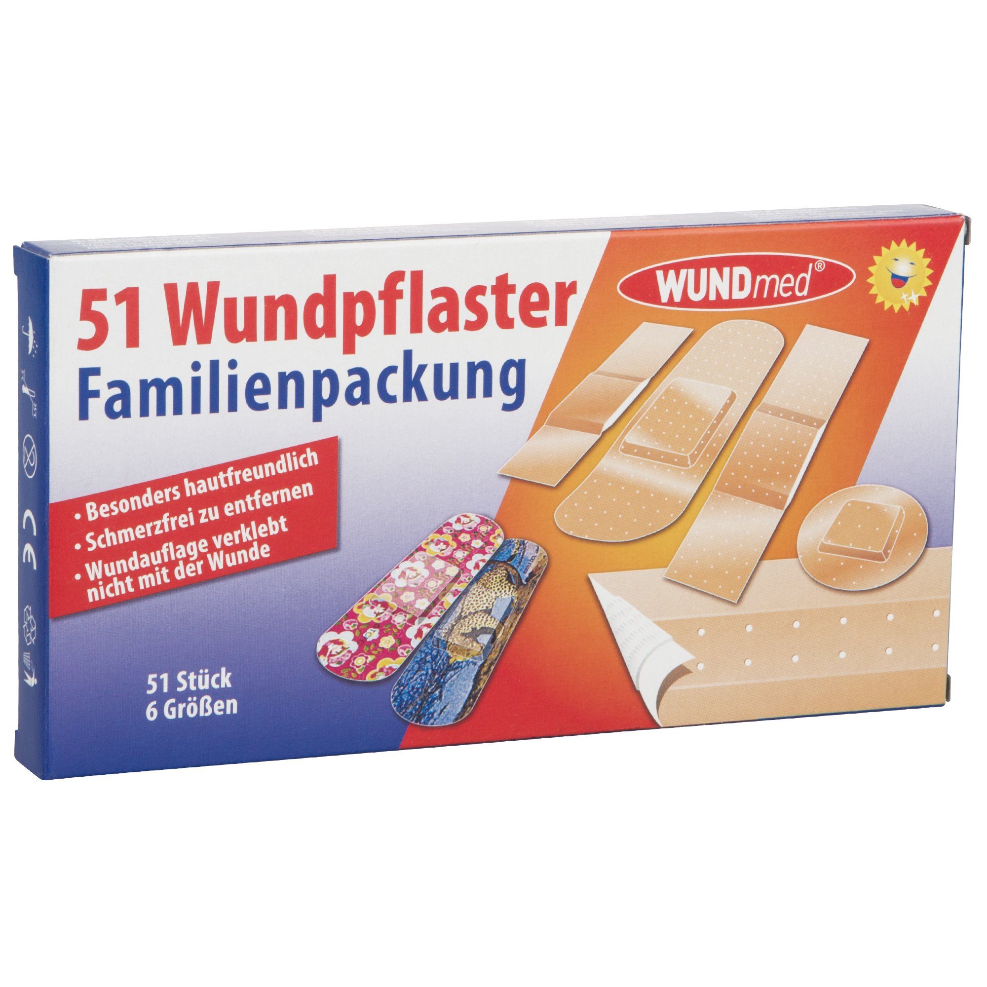 Die WUNDmed Wundpflaster Familienpackung umfasst 51 besonders hautfreundliche Pflaster in 6 Größen zum Abdecken von kleineren Wunden. Die Wundauflage der Wundpflaster verklebt nicht mit der Wunde und die Pflaster lassen sich nach Gebrauch schmerzfrei entfernen. Das Pflasterset enthält auch Motivpflaster für Kinder (Motive können von der Abbildung abweichen).