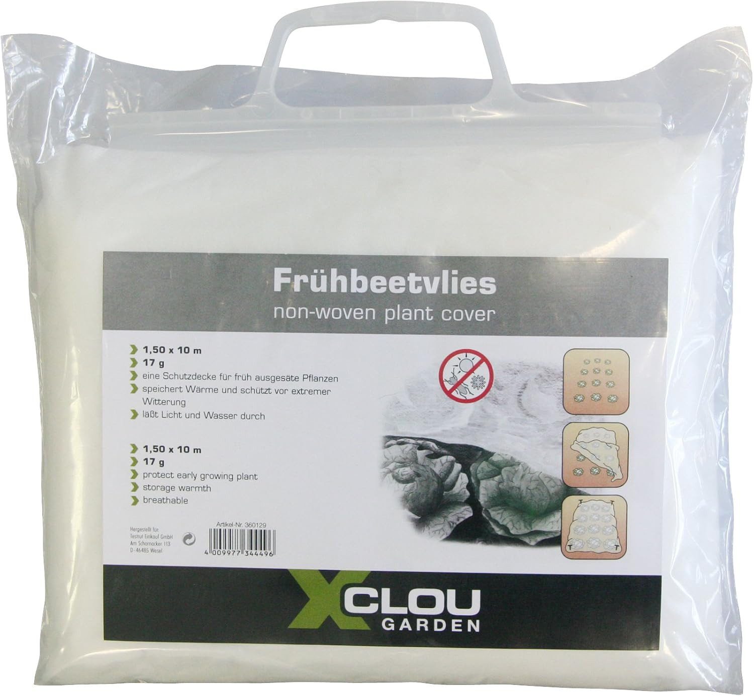 Xclou Gartenvlies schützt vor extremen Witterungseinflüssen, Frostschutzvlies für früh ausgesähte Pflanzen, Unkrautvlies speichert Sonnenwärme, Vlies ist licht- und wasserdurchlässig, Frühbeetvlies wiegt ca. 17g/m², Vliesabdeckung ca. 1.5 x 10 m Gartenvlies - Speziell für den winterlichen Frostschutz, schützt vor Kälte und hindert die zarte Frühsaat nicht am wachsen, super leichtes Material, Vlies kann individuell zurecht geschnitten werden Abdeckvlies in weiss, lässt Wasser durch, so dass es keuine Probleme beim Gießen der Saat gibt, Vliesabdeckung speichtert Sonnenwärme und sorgt somit für ein optimals Gedeihergebnis Frostschutzvlies ist mehrfach verwendbar, einfach vorsichtig abwaschen und für die nächste Saison trocken in der Garage, im Keller oder in der Abstellkammer aufbewahren Lieferumfang: Gartenvlies ca. 1,5 x 10 m, ca. 17g/m², weiss