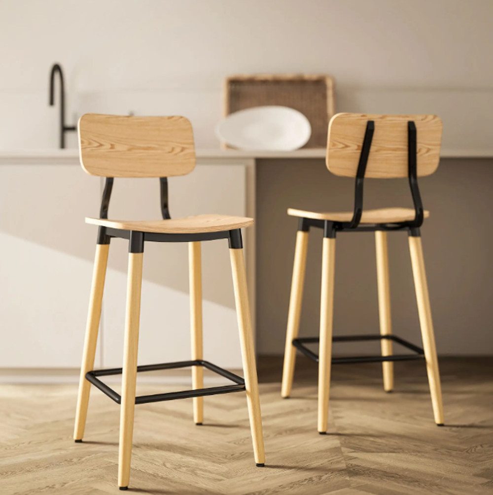 Elegantes Aussehen: Sitzfläche, Rückenlehne und Stahlbeine dieses Barhockers sind mit einer Holzmaserung versehen, die durch ein schwarzes Metallgestell ergänzt wird, das einen raffinierten nordischen Touch verleiht. Eine stilvolle Ergänzung für Küchen, Essbereiche oder Hausbars