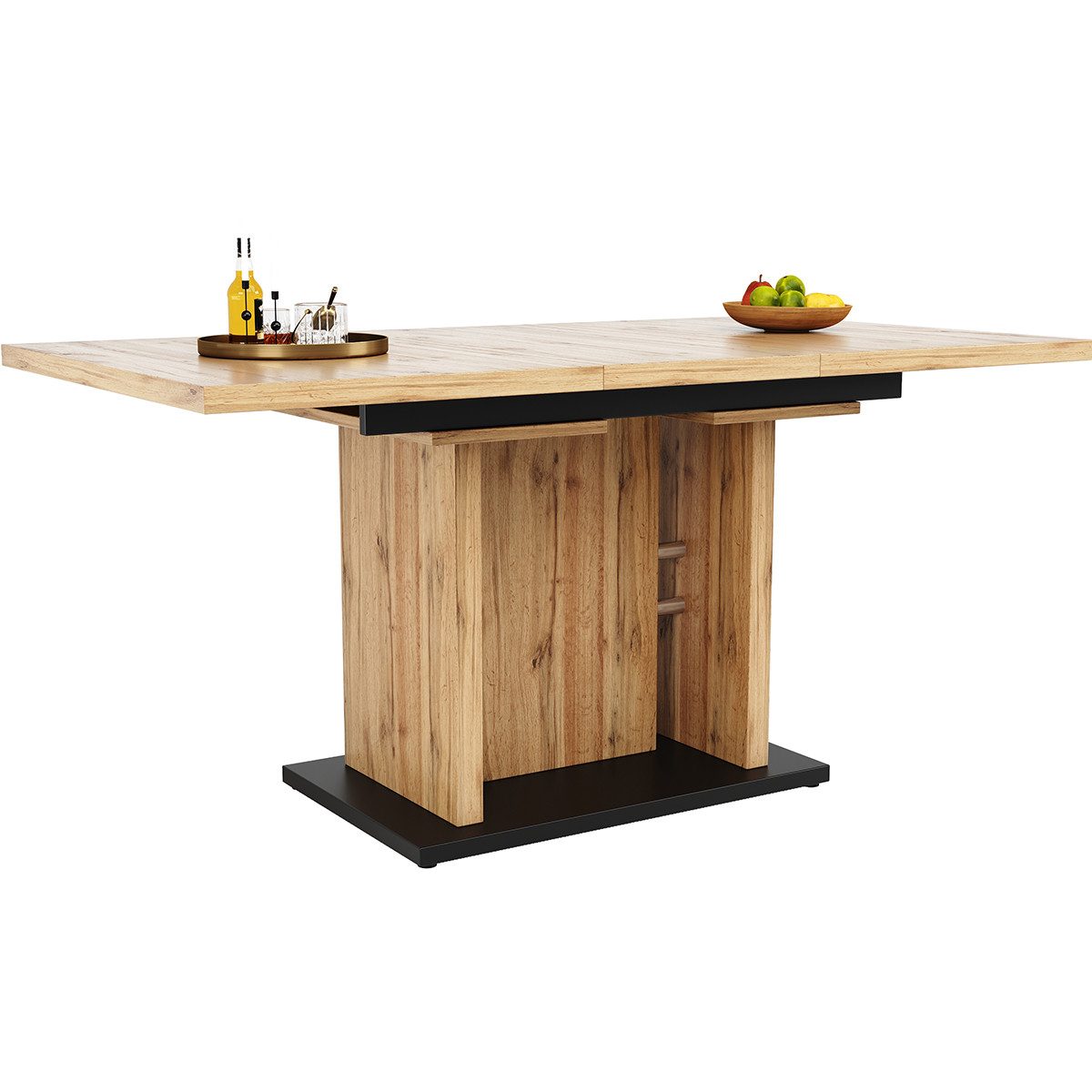Das einzigartige Design und die Vielseitigkeit des Teleskoptisches ermöglichen die Vergrößerung oder Verkleinerung der Tischplatte je nach Bedarf. Er kann beispielsweise erweitert werden, um bei Bedarf mehr Platz auf der Tischplatte zu schaffen, und kann problemlos zu einem Essbereich für 6 Personen erweitert werden. 8 Personen, die den Bedürfnissen von Familientreffen und Restaurants gerecht werden, kann je nach den Bedürfnissen des Ortes auch als temporäre Werkbank, Lerntisch oder als Ort für