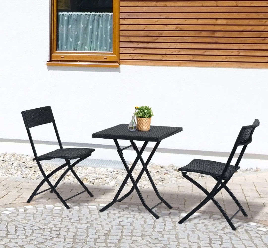 Schicke Balkongarnitur: Das schwarze Balkonmöbel-Set kommt mit zwei Klappstühle und einem schicken Rattan Tisch und macht sich ideal in Ihrem Innen- wie auch Außenbereich.