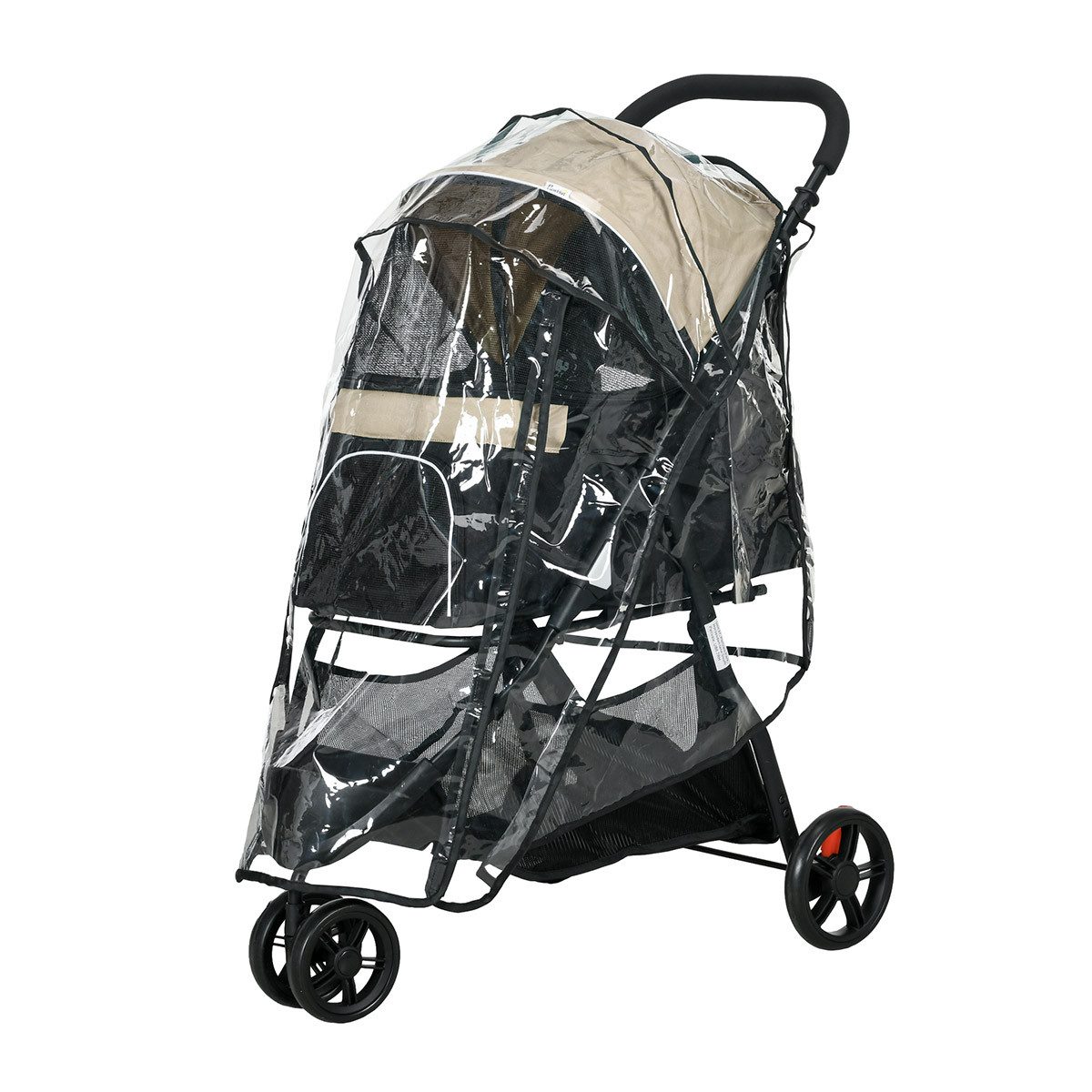 Vier Räder: Die Bremsen und die Stoßdämpfungseinrichtung an den hinteren Rädern dieses Hundewagens sorgen für Sicherheit, während die 360° beweglichen Vorderräder für reibungslose Fortbewegung und einfaches Schieben sorgen