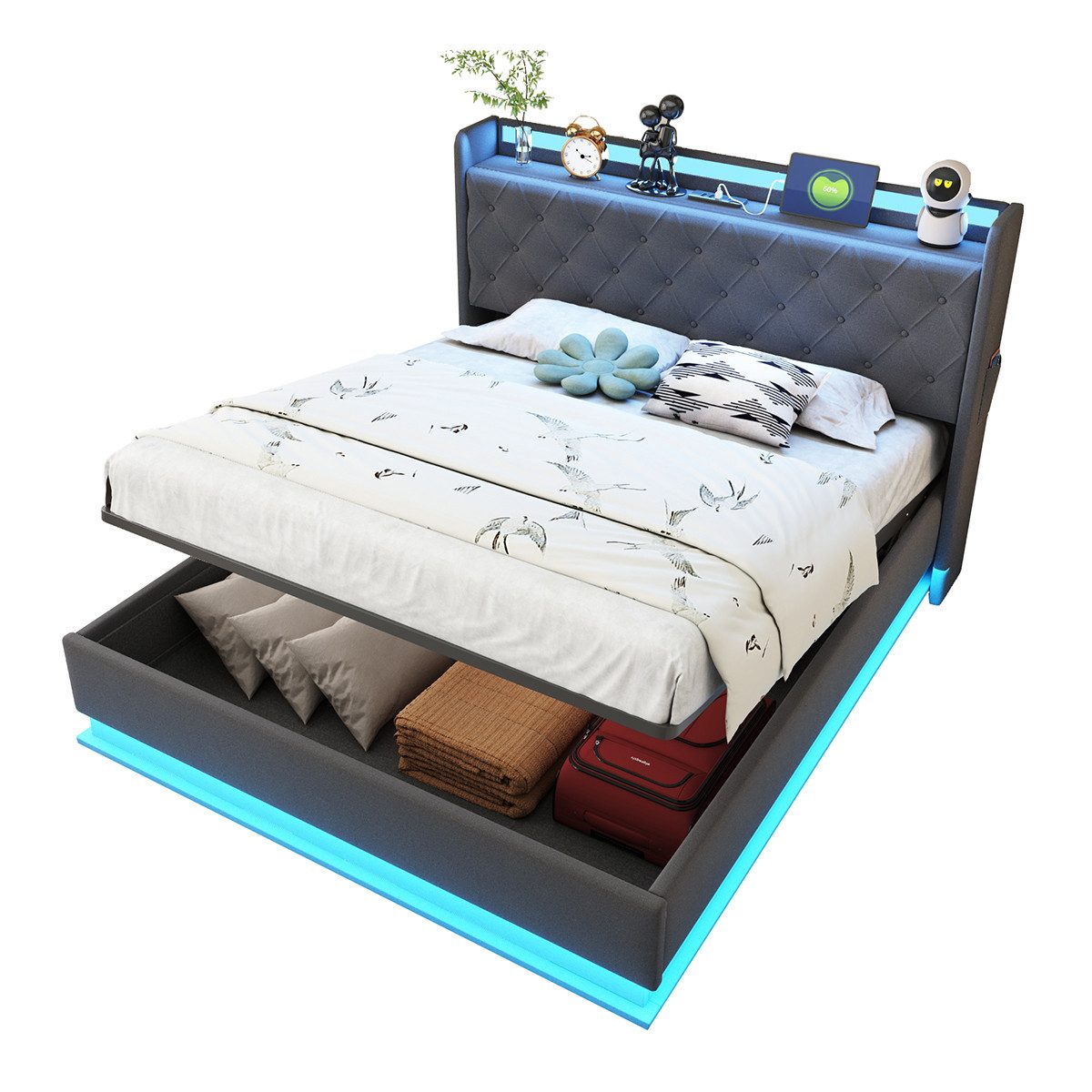 Mehrfarbige Led-Leuchten: Unser Bett Passen Sie das Ambiente Ihres Schlafzimmers mit LED-Leuchten an, die zwischen mehreren Farben wechseln können, um die perfekte Atmosphäre zum Entspannen zu schaffen.
