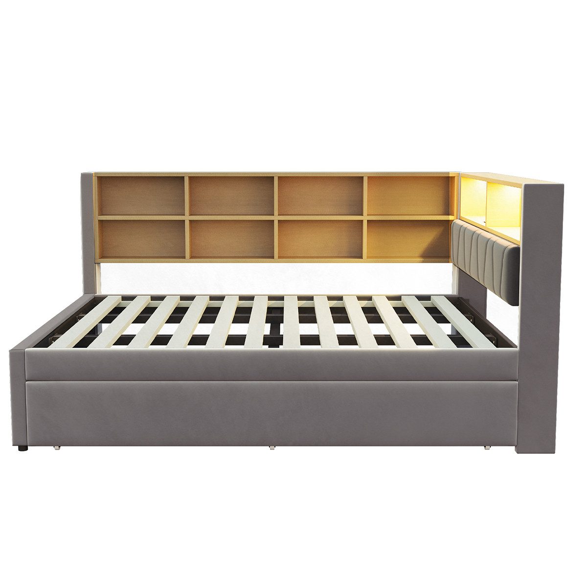 Ausgestattet mit LED-Leuchten und Multifunktions-Ladeanschlüssen: Das Staufach des Schlafsofas ist mit LED-Leuchten und Multifunktions-Ladeanschlüssen (USB-Ladeanschluss + Tape-C-Ladeanschluss + Stecker-Ladeanschluss) ausgestattet, die es Kunden ermöglichen, Datenkabel mit verschiedenen Schnittstellen zum Aufladen beim Ausruhen oder Arbeiten zu verwenden und gleichzeitig Beleuchtungsfunktionen bereitzustellen.