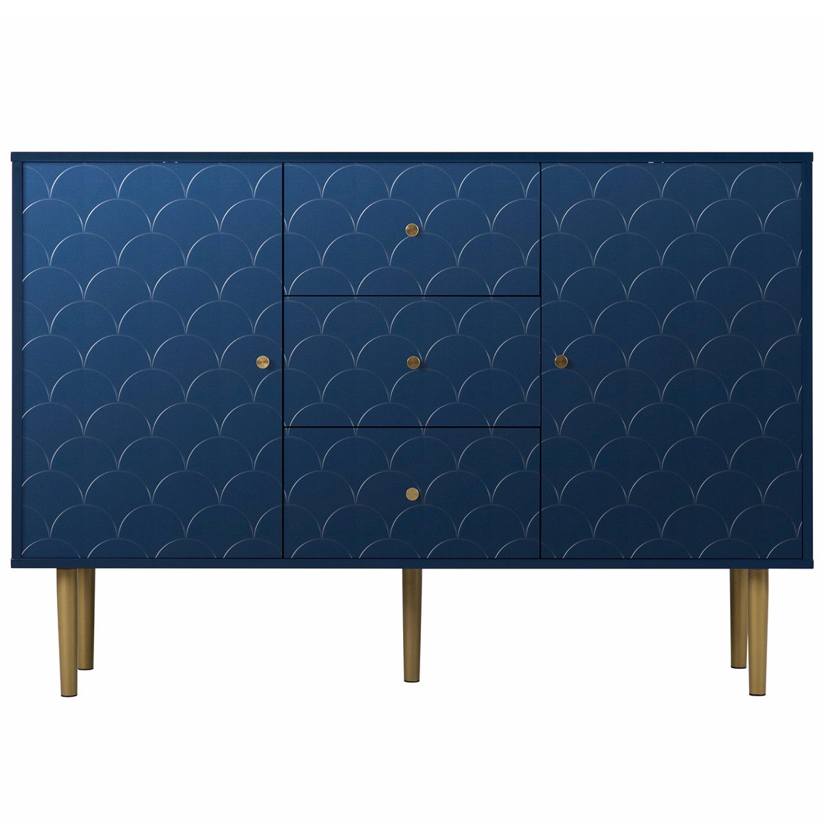 Einzigartige Platte mit Fischschuppenmuster: Das marineblaue Fischschuppenmuster und die champagnerfarbenen Metallbeine verleihen diesem Schrank eine elegante Präsenz im Schlaf- und Wohnzimmer.Das Produkt ist mit hochwertigen Metallscharnieren ausgestattet, die es ermöglichen,die Abstände zwischen den Türen und Schubladen zu regulieren, wodurch die Platten ein kohärentes und ästhetisch ansprechenderes Fischschuppenmuster erhalten.