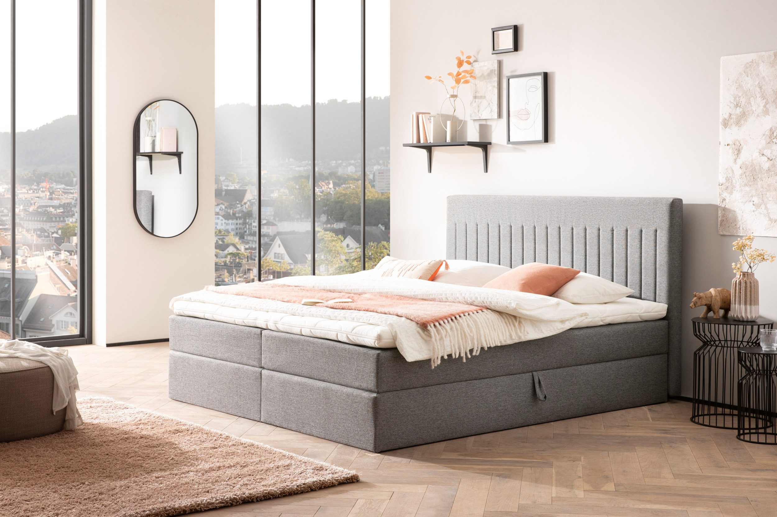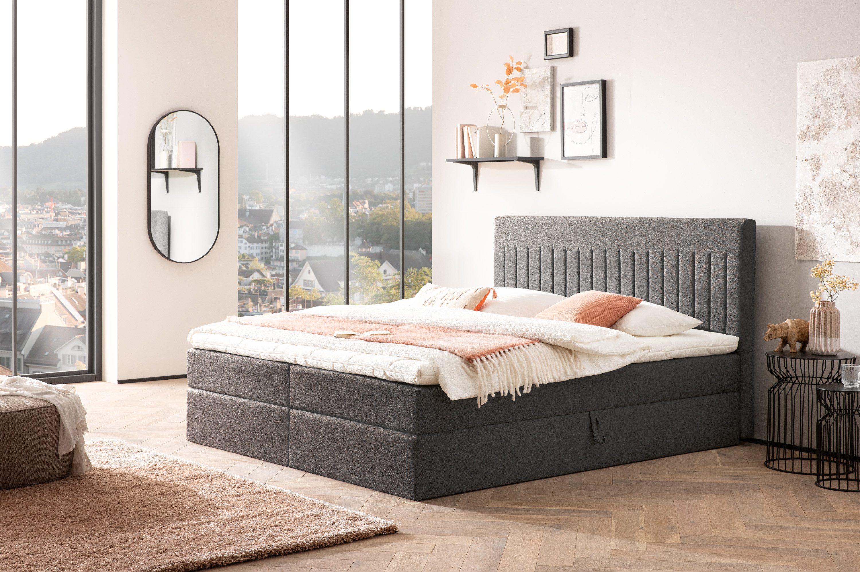 Der qualitative Aufbau des Bettes überzeugt auf ganzer Linie. Die bodentiefe Bettkastenbox mit Stauraum bietet genügend Platz für Bettwäsche, Kissen und Decken, während die komfortablen 7-Zonen Taschenfederkernmatratzen und der Komfortschaumtopper eine optimale Druckentlastung und einen erholsamen Schlafkomfort garantieren.