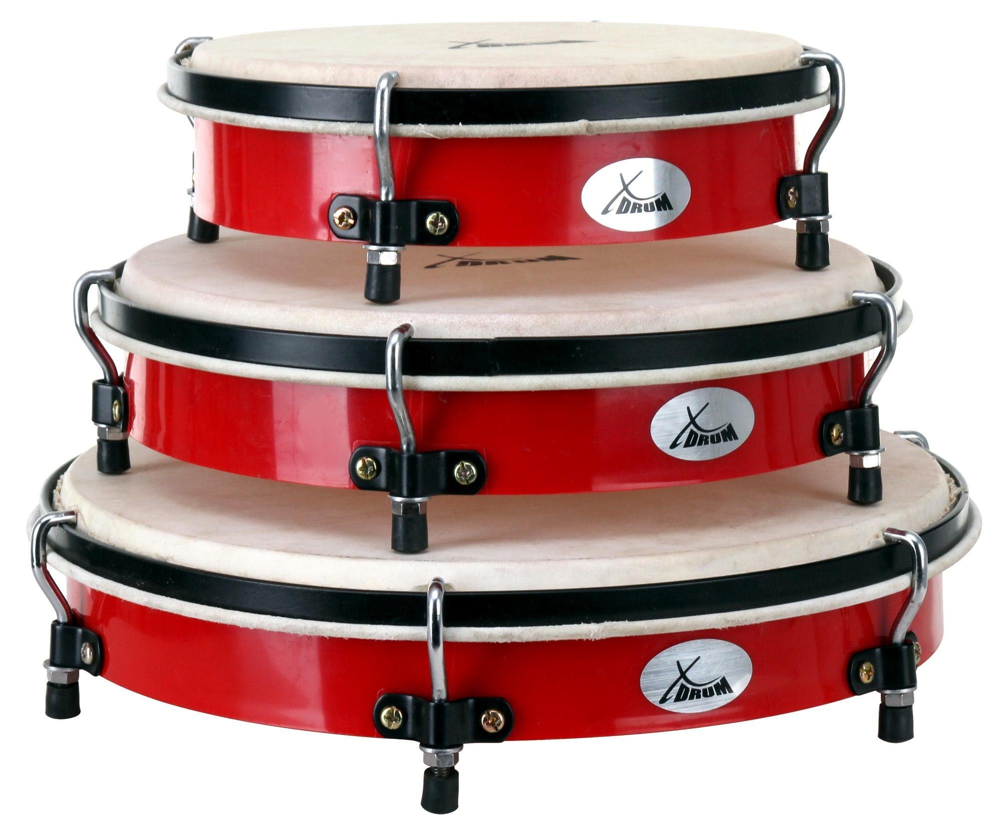 Die XDrum Handtrommeln bestehen aus einem kreisrunden Kunstoffrahmen und sind jeweils auf einer Seite, wie es für Rahmentrommeln üblich ist, mit einem Naturtrommelfell bespannt. Die Tiefe der weinroten Kunststoffrahmen beträgt jeweils 7,5 cm. Im Set sind drei Trommeln mit unterschiedlichen Durchmessern (8", 10" und 12"), Stimmschlüssel als auch eine passende Nylon Tragetasche enthalten.