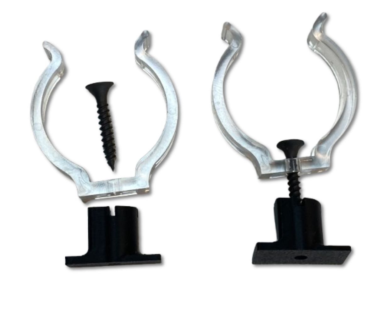 Universal Halter Kunststoff schwarz für Holz-Akustik-Paneele, zur Montage von vielen Dingen. Hier im 2er Pack mit Klammern für Leuchtstäbe mit einem Durchmesser von 38mm. Einfach schwarzen Haler in den gewünschten Schlitz der Paneele stecken und mit einem Schraubendrehen um 90° drehen. Danach die klammer mit der Schraube in der Mitte des Kunststoff Halters eindrehen.
