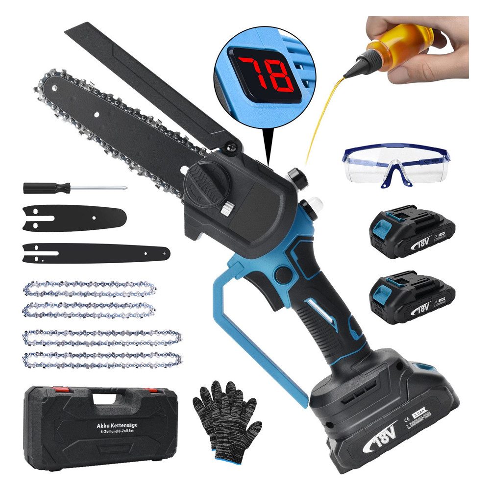 1 x Handkettensäge, 2 x 2.0Ah Akku, 1 x Aufbewahrungsbox, 2 x 6-Zoll-Kette, 2 x 8-Zoll-Kette, 1 x 6-Zoll-Führungsschiene, 1 x 8-Zoll-Führungsschiene,