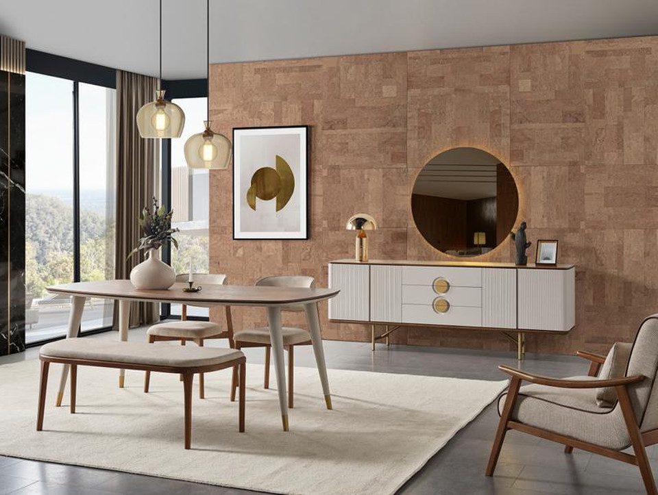 Serie | 7tlg. Esszimmer Set(Esstisch+2x Stühle+Hocker+Kommode mit Spiegel) |