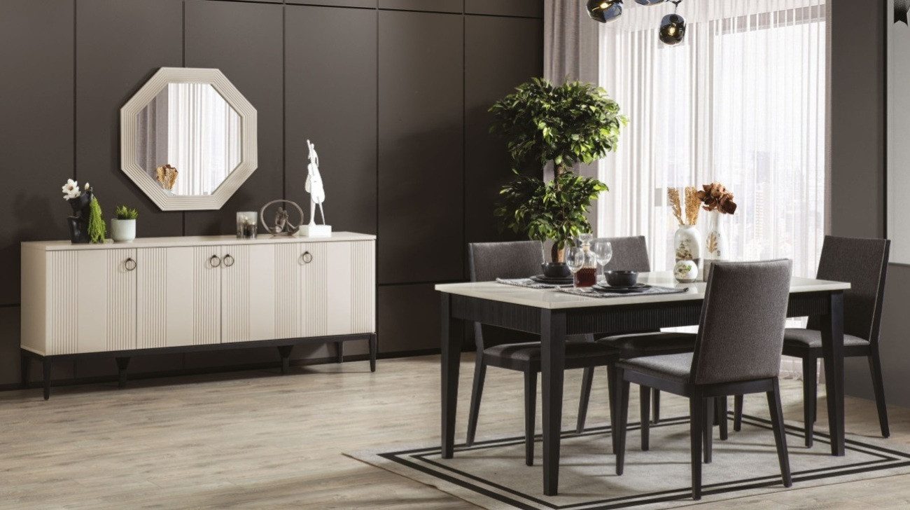 Serie | 6tlg. Esszimmer set(Esstisch+4x Stuhl+Sideboard mit Spiegel) |
