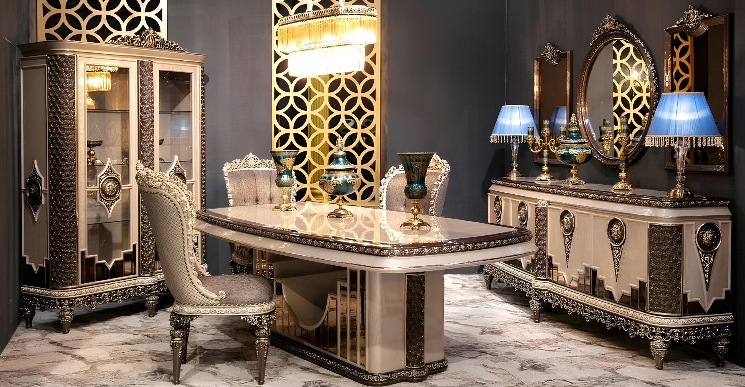 Serie | 9tlg.Esszimmer Set(Esstisch+6x Stühle+Kommode mit Spiegel+Vitrine) |