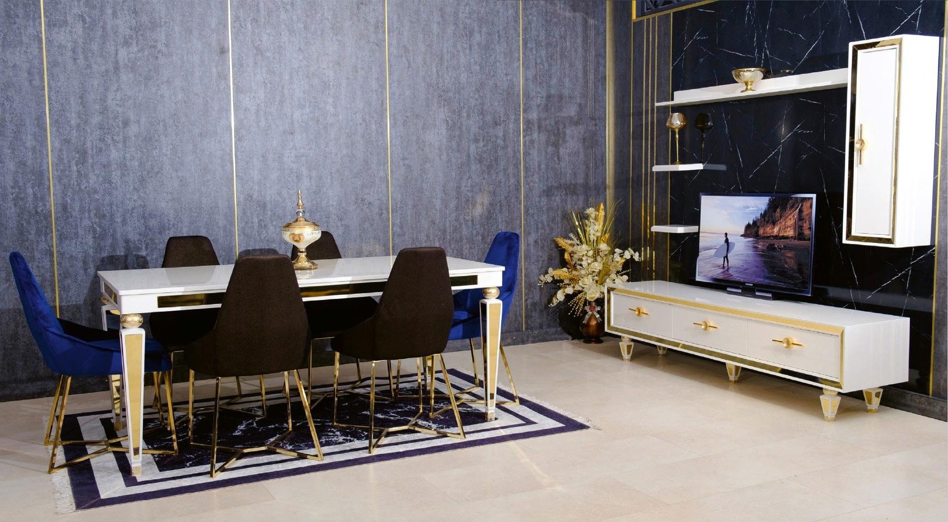 Serie | 9tlg. Esszimmer Set (Esstisch+6X Stühle+TV-Ständer + Wandregal) |