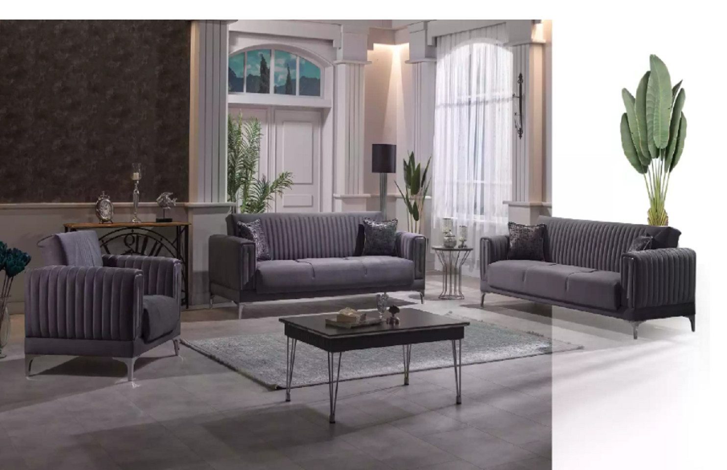 Polstergarnitur Zeitgemäße Graue Sofagruppe mit 3+3+1 Sitzplätzen samtigem Sessel