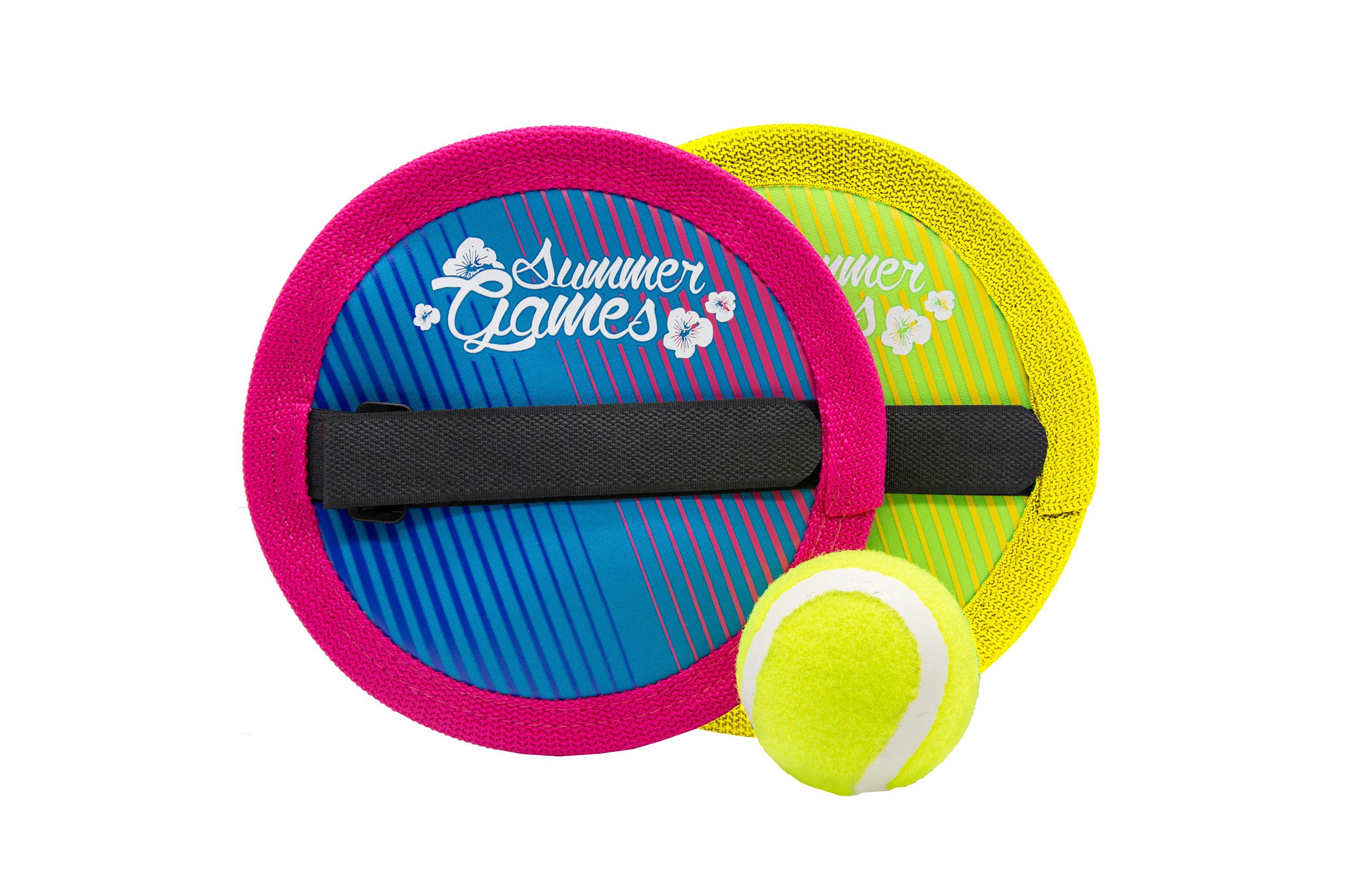 Entdecken Sie das perfekte Outdoor-Spielvergnügen mit dem Summer Games Neopren Catch-Ball-Set! Dieses Set besteht aus zwei hochwertigen, leichtgewichtigen Fangscheiben in attraktiven Farbkombinationen (Blau-Pink und Grün-Gelb), einem griffigen Ball und einer praktischen Netztragetasche – ideal für spontane Spielmomente am Strand, im Schwimmbad oder im Garten. Die Fangscheiben sind aus weichem Neopren gefertigt, was sie besonders benutzerfreundlich und angenehm zu halten macht. Dank des verstellbaren Riemens passen sie sich jeder Handgröße an. Das stylische Design mit sommerlichen Streifen und Blütenmotiven macht das Set zu einem echten Hingucker. Erleben Sie aktiven, gemeinsamen Spielspaß im Freien und genießen Sie unvergessliche Sommermomente!
