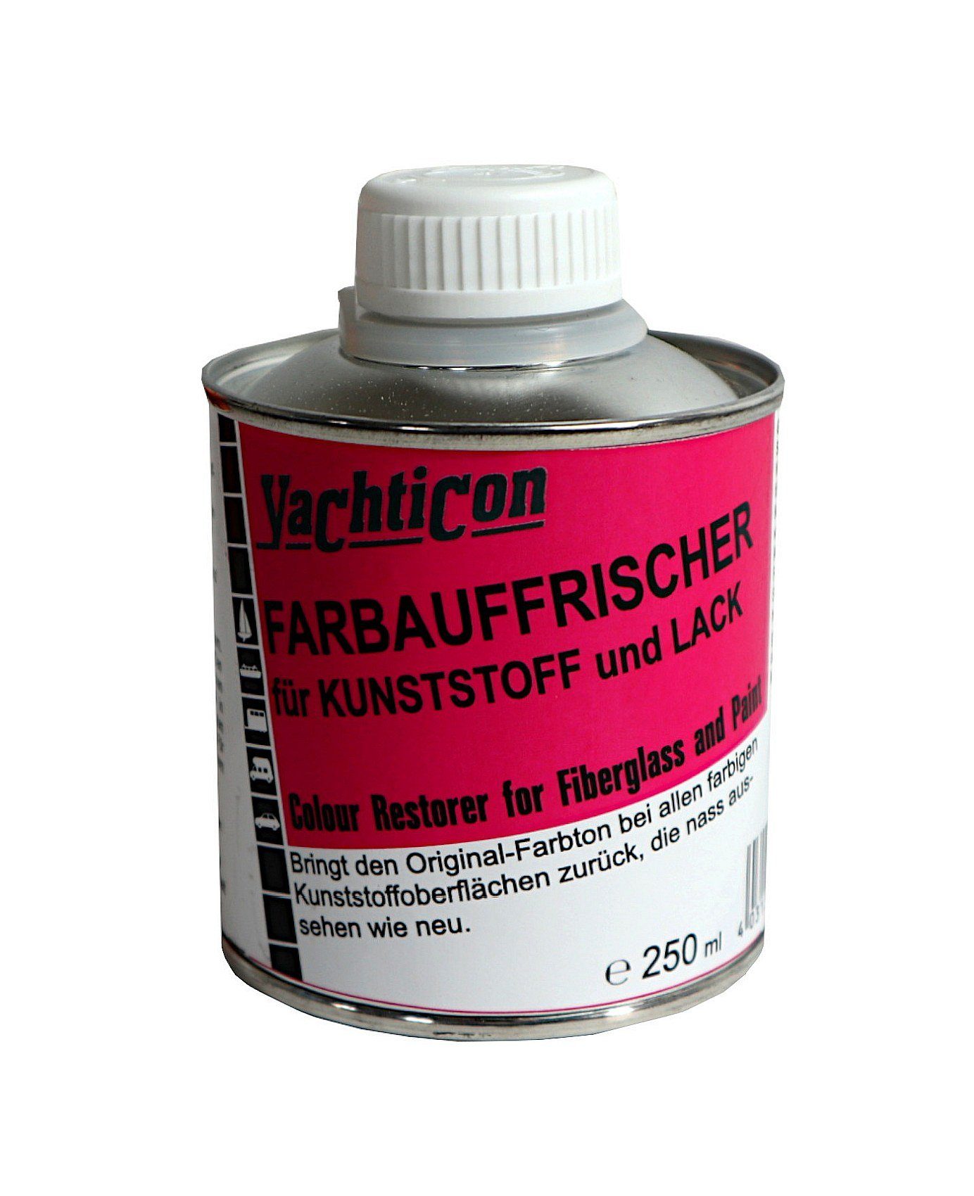 Farbauffrischer für Kunststoff und Lack von Yachticon mit 250 ml Inhalt. Diese Flüssigkeit bringt den Original-Farbton bei allen farbigen Kunststoffoberflächen zurück, die nass aussehen wie neu. Es ist kein Polieren und Schleifen erforderlich und reinigt auch vernarbte Kunststoffflächen und entfernt Politurreste. Achtung: Schädlich für Haut und Wasserorganismen.