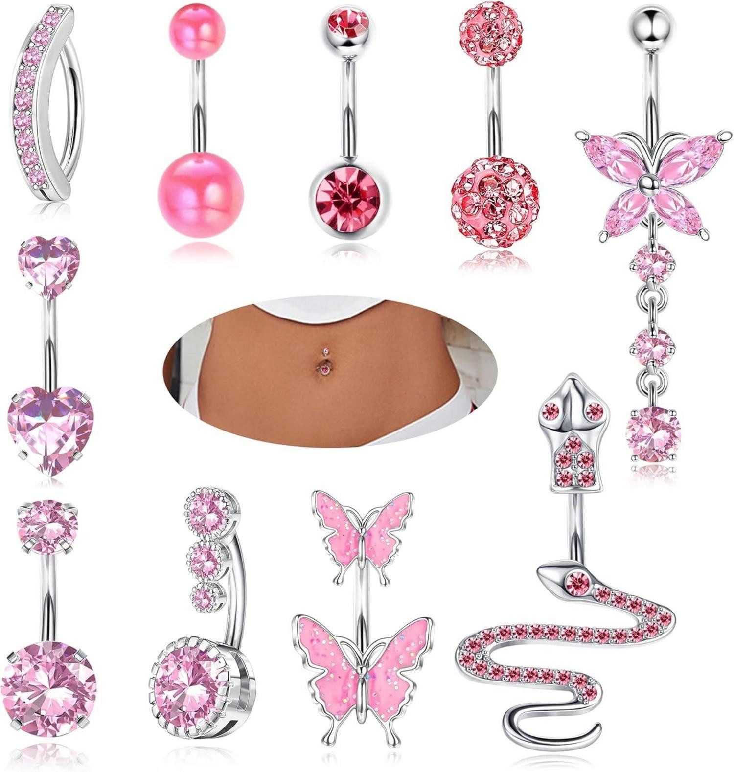 Das Set enthält 10 Bauchnabelpiercings in verschiedenen Stilen, darunter Herzen, klassische Runde, Schlangen, Schmetterlinge und Anhänger, die alle mit rosa und blauem Strass verziert sind. Dieses Set eignet sich perfekt als Geschenk für besondere Anlässe wie Feiern, Geburtstage oder Sommeraktivitäten am Strand.