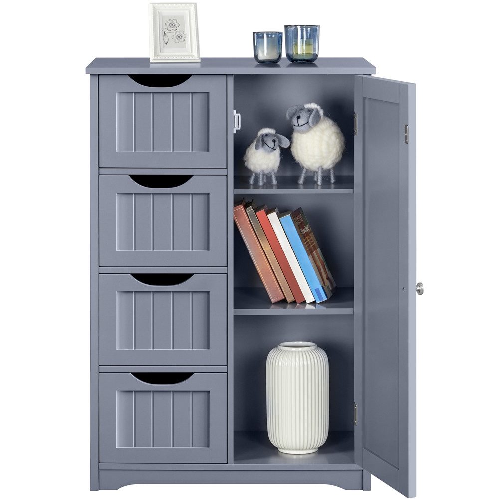 Durch einen geräumigen Aufbewahrungsschrank können Sie das ganze Durcheinander hinter einer Tür oder außer Sichtweite verstauen. Dieser Schrank verfügt über 4 Schubladen und 1 Schrankfach mit dem höhenverstellbaren Einlegeboden. Dieser Schrank bringt Ordnung in Ihr Badezimmer und verleiht dem ganzen Raum dank seines modernen Aussehens Charme. Die einfache Form und klare Linienführung passt zu einer Vielzahl an Raumdesigns. Dieser Bodenschrank eignet sich ideal für das Badezimmer, Schlafzimmer, Balkon, Küche, Eingangsbereich und dergleichen.