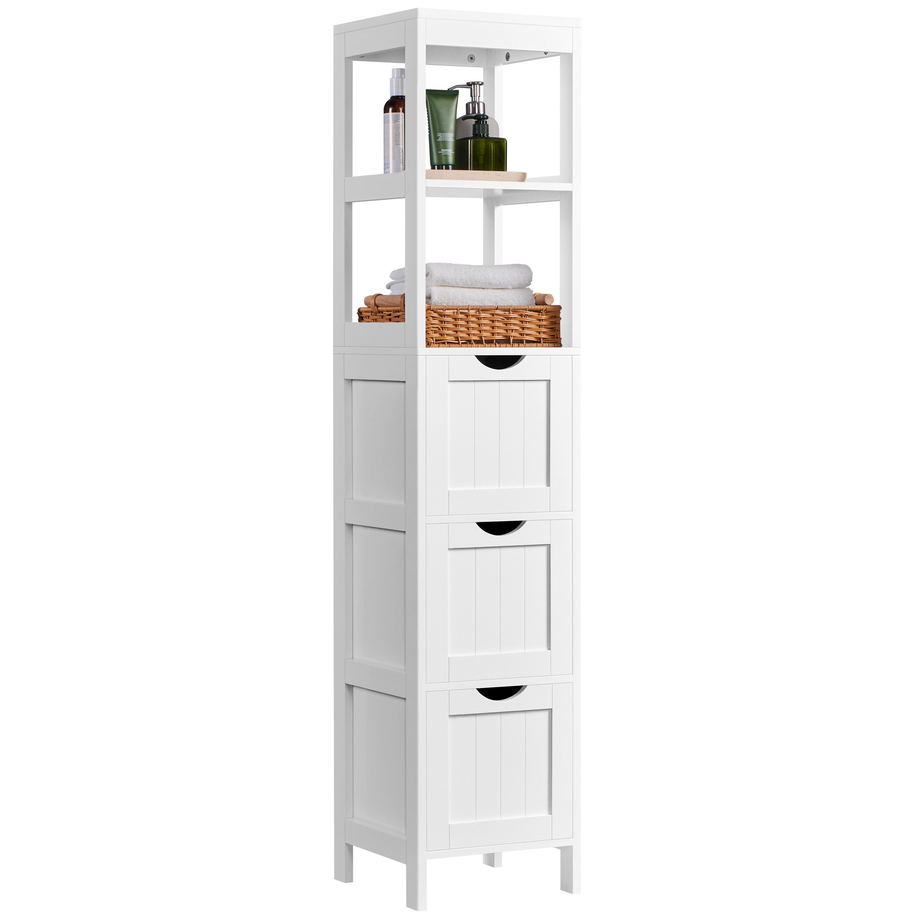 Brauchen Sie einen praktischen, platzsparenden Badezimmerschrank, um endlich Ordnung zu schaffen? Dieser schlanke Hochschrank ist die optimale Lösung! Mit fünf Ablageflächen – darunter zwei offene Fächer und drei Schubladen – bietet er viel Stauraum für Handtücher, Toilettenpapier, Shampoo, Duschgel und mehr. Die Position der drei Schubladen ist nach Bedarf anpassbar. Der Schrank ist nicht nur im Badezimmer einsetzbar, sondern auch in der Küche, im Wohnzimmer oder Flur.