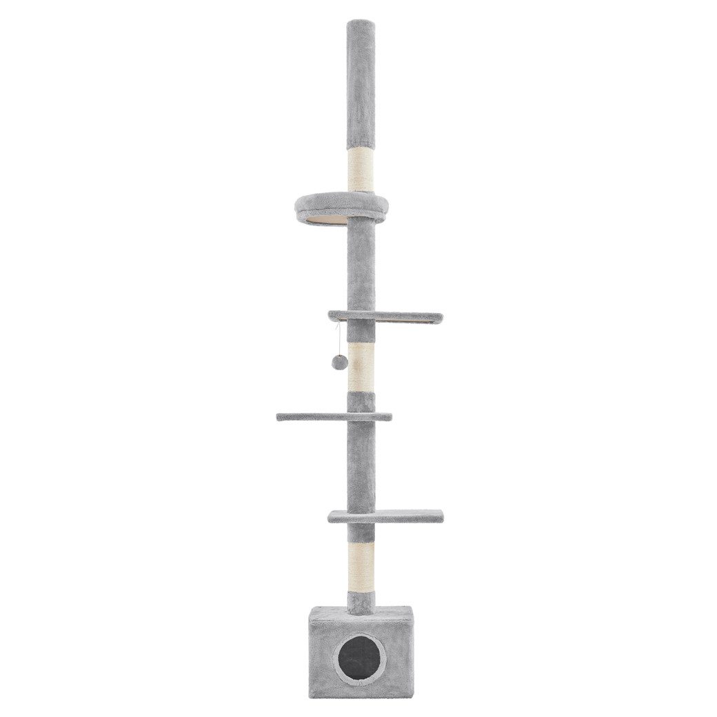 Dank des Deckenspanners können Sie den hohen Katzenbaum leicht von 226 cm bis 265,5 cm verstellen, sodass er einfach an Böden und Decken anzubringen ist. Dieser stabile Kletterbaum verfügt über eine Katzenliege, vier flexibel-montierten Plattformen und ein Katzenhaus am Boden. Dank der stabilen Konstruktion und der Kippsicherung können die Stubentiger sicher springen. Dieses Katzenmöbel erfordert die Montage. Folgen Sie bitte den Anweisungen der illustrierten Anleitung und bauen Sie eine Unterhaltungszone für Ihre Katzen!