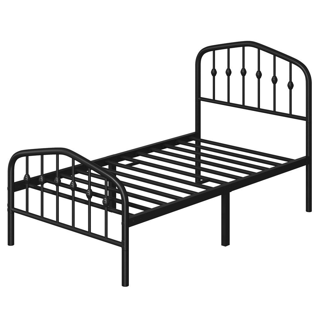 Lassen Sie sich von diesem Metallbett eine angenehme Nachtruhe bescheren! Dieses Bett ist mit einem hohen, gewölbten Kopf- und Fußteil ausgestattet. Das klassische Aussehen verleiht Ihrem Zimmer einen eleganten Vintage-Charme. Das hohe Kopf- und Fußteil ist für die Matratzen unterschiedlicher Dicken geeignet. Zwischen den hohen Kopf- und Fußteil und Liegefläche gibt es der Abstand von 24,5 cm. Dank des praktischen Designs können Sie die unterschiedlichen Stärken der Matratzen und den optimalen Komfort wählen. Mit dem hohen Kopfteil können Sie ein Kissen hinter sich legen, um bequem zu lesen oder fernzusehen. Die Bodenfreiheit von 32 cm bietet viel Stauraum unter dem Bettrahmen. Hier können Sie die Koffer und Aufbewahrungsboxen stellen, um die Kleidungen, Schuhe, Bettdecken außerhalb der Saison zu verstauen. Dieses praktische Metallbett ist für das Gästezimmer, Wohnzimmer, Büro, Loft und dergleichen geeignet und erfordert eine leichte Montage.