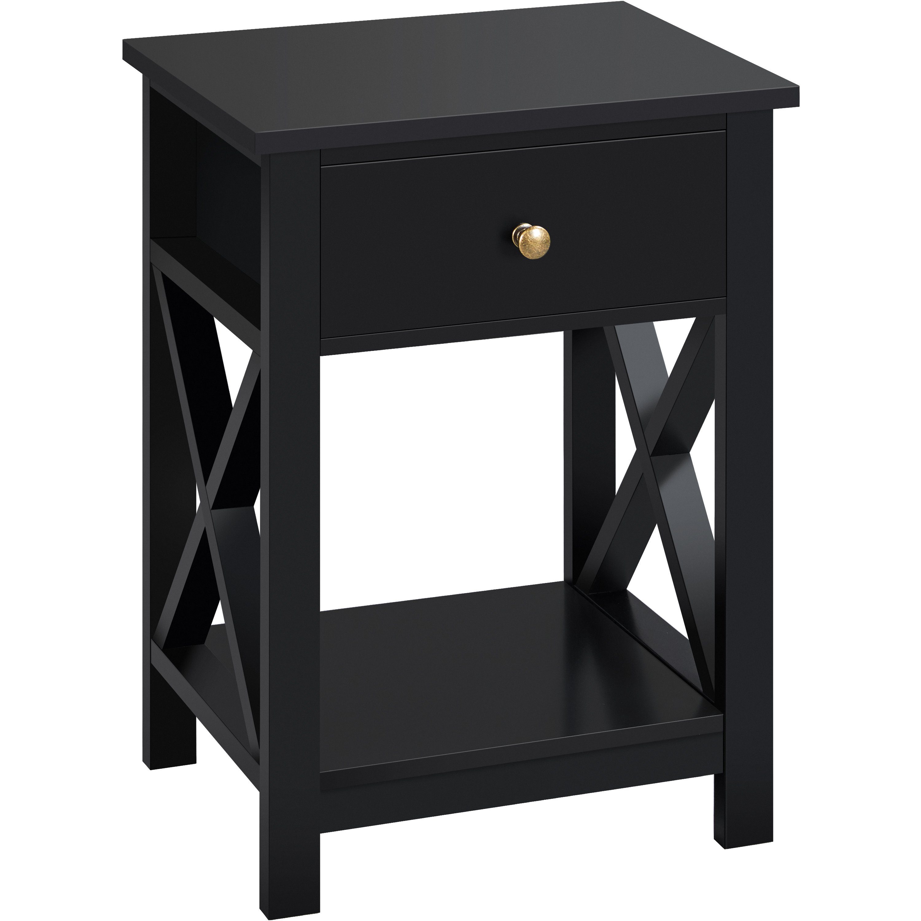 Dieser Tisch ist aus den robusten MDF-Holzplatten in der Emissionsklasse E1, die für einen sicheren und langfristigen Gebrauch sorgen. Die Oberfläche ist mit der wasserabweisenden Beschichtung versehen, die die tägliche Pflege erleichtert. Die x-förmige Stützbeine an den beiden Seiten sind für eine hohe Haltbarkeit und Stabilität ausgestattet. In der Schublade und auf der unteren offenen Ablage können Sie ihre Alltagsgegenstände in Ordnung und griffbereit aufbewahren. Dieser Tisch eignet sich ideal im Schlafzimmer, Wohnzimmer, Büro und dergleichen.