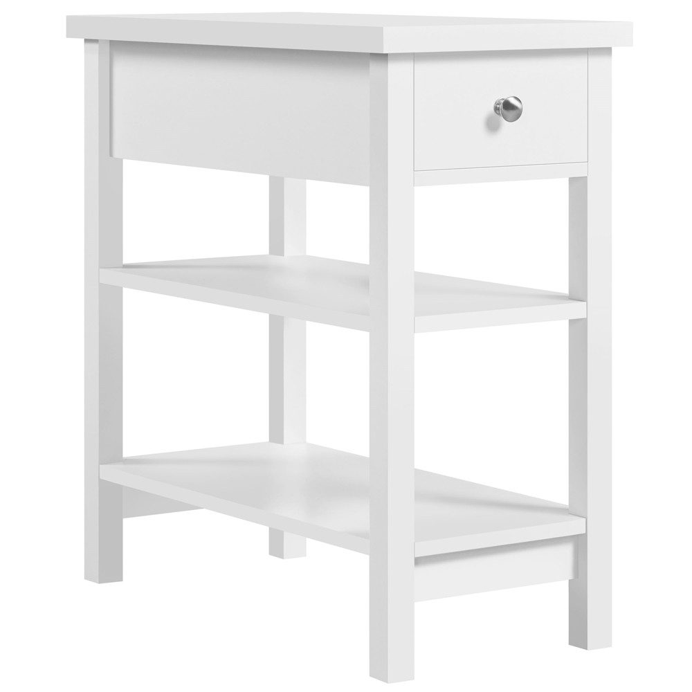 Dieser minimalistische Sofatisch besteht aus einer Schublade und zwei offenen Ablagefächern, die genügenden Stauraum für Ihr Handy, Brille, Zeitschriften, Fernbedienung und Creme bieten. Der runde Metallgriff an der Schublade trägt zur Ästhetik bei und ermöglicht gleichzeitig ein leichtes Öffnen und Спрятать. Dieser Beistelltisch sieht dank des minimalistischen Designs schön aus und verleiht Ihrem Zimmer Charme aus. Ob im Wohnzimmer, im Schlafzimmer, in der Küche, im Flur oder im Büro, er passt sich dem Stil Ihres Hauses an.