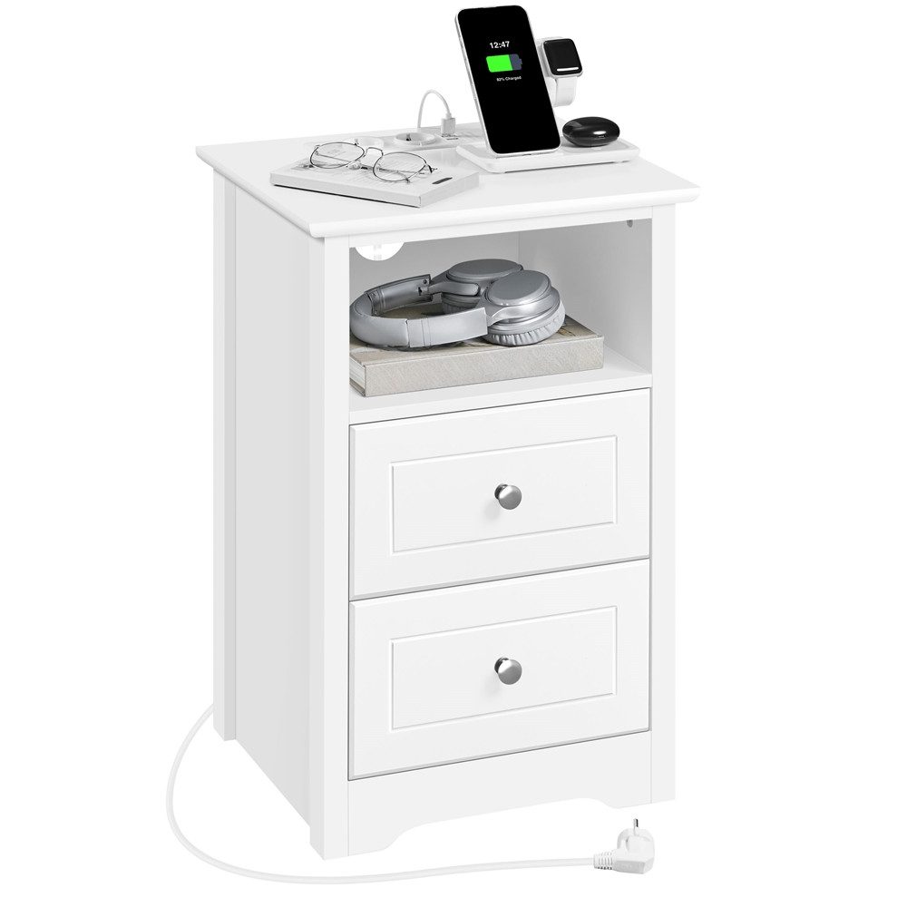 Entscheiden Sie sich für schlichte Funktionalität! Dieser Beistelltisch mit integrierter Ladestation ist eine durchdachte Lösung für Ihr Zuhause. Er verfügt über zwei Steckdosen, zwei USB-Anschlüsse und ein 2 m langes Netzkabel – ideal zum Aufladen von Handy, Leselampe oder Tablet. Das offene Fach und die zwei Schubladen bieten Platz für Brille, Fernbedienung, Bücher, Handcreme oder Kabel. Auf der Tischplatte finden Lampe, Vase oder Fotorahmen ihren Platz. So bleibt alles ordentlich und stets griffbereit.