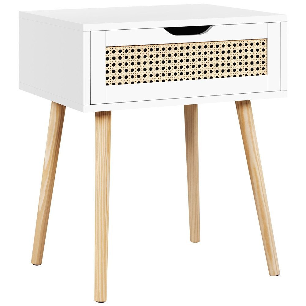 Dieser Beistelltisch mit dem einzigartigen Rattan-Design ist wirklich ein Blickfang im Raum! Die schlichte Form und das massive Holz bringen Ihrem Zuhause den Charme im Landhausstil. Gleichzeitig bietet dieser Tisch Ihnen den Komfort der Aufbewahrung und des Zugriffs auf Ihre Gegenstände. Mit der Schublade können Sie die Brille, Bücher, Handcreme, Fernbedienung und weitere Dinge aufbewahren. Auf der Tischplatte gibt es Platz für die Lampe, die Topfpflanze und den Fotorahmen. Dank der wasserabweisenden Beschichtung ist es leicht, diesen Tisch zu pflegen und zu reinigen. Er ist ein idealer Ordnungshelfer und eine formschöne Dekoration im Wohnzimmer, Schlafzimmer, Tagungsraum, Flur und dergleichen.