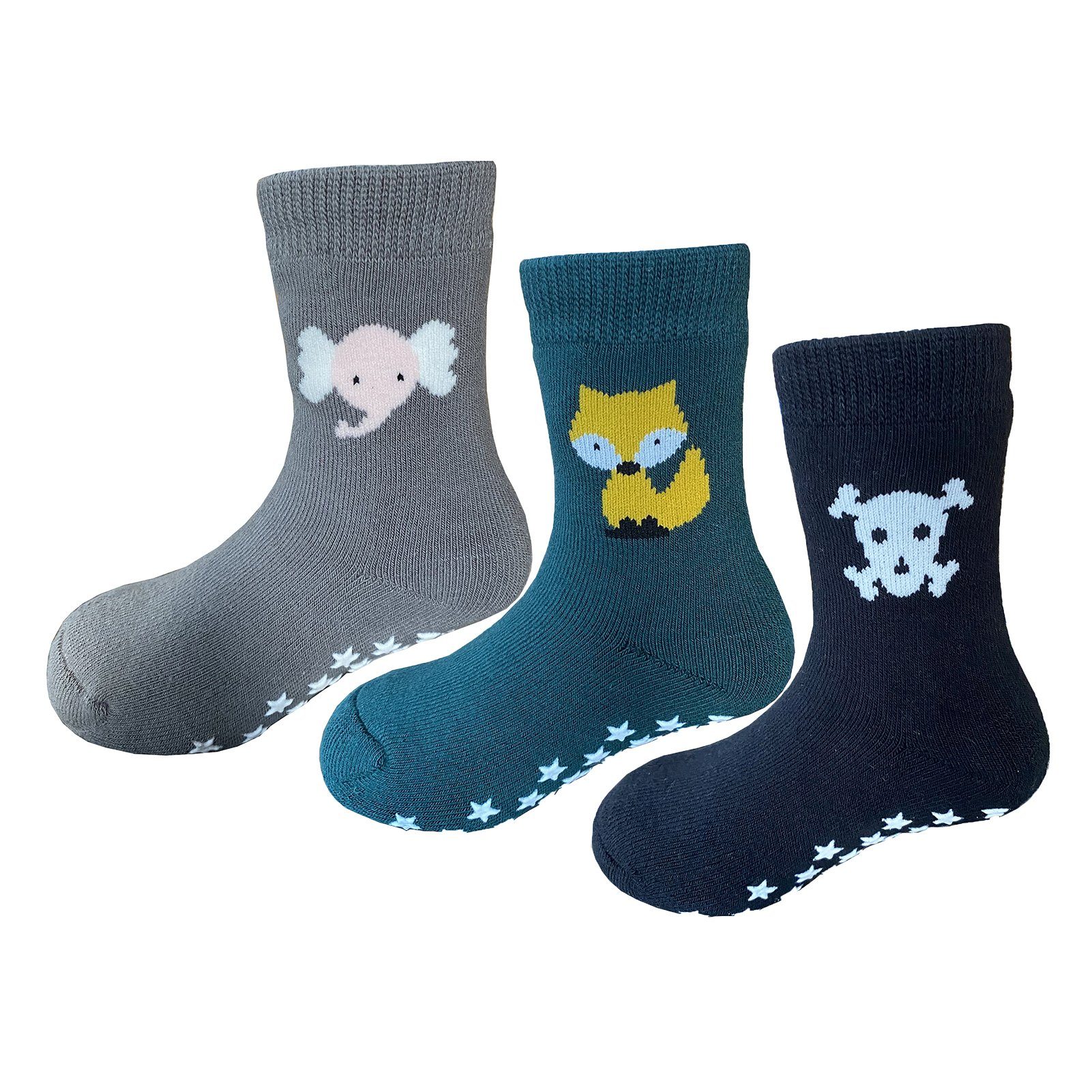 Yalion® weiche Kinder Socken mit Halbplüsch und Stoppernoppen an der Fußsohle im 3er Pack sind gegen Wegrutschen auf glatten Böden und kalte Füße gedacht. Die Socken sind sehr elastisch und bequem, die perfekte Passform garantiert dabei einen optimalen Tragekomfort. In Jungenfarben und Mädchenfarben sind die Socken erhältlich. Das Material besteht aus 73,2% Baumwolle; 23,2% Polyamid; 3,6% Elasthan. Gerne werden diese Socken auch über die Strumpfhosen gezogen, wodurch das Baby und Kleinkind immer warme Füße hat. Für alle die sich nicht sicher sind, welche Sockengröße man nimmt, es wird die Sockenlänge eingefügt, die Alter Angabe sind nur Richtwerte. Es kann zu Größenunterschieden kommen, weil Kinder unterschiedlich schnell wachsen. Sockenlänge(Fußlänge): 9 cm (6-12 Monate); Sockenlänge(Fußlänge): 10 cm (12-18 Monate); Sockenlänge(Fußlänge): 11 cm (18-24 Monate). Sockenlänge(Fußlänge): 12 cm (24-36 Monate).