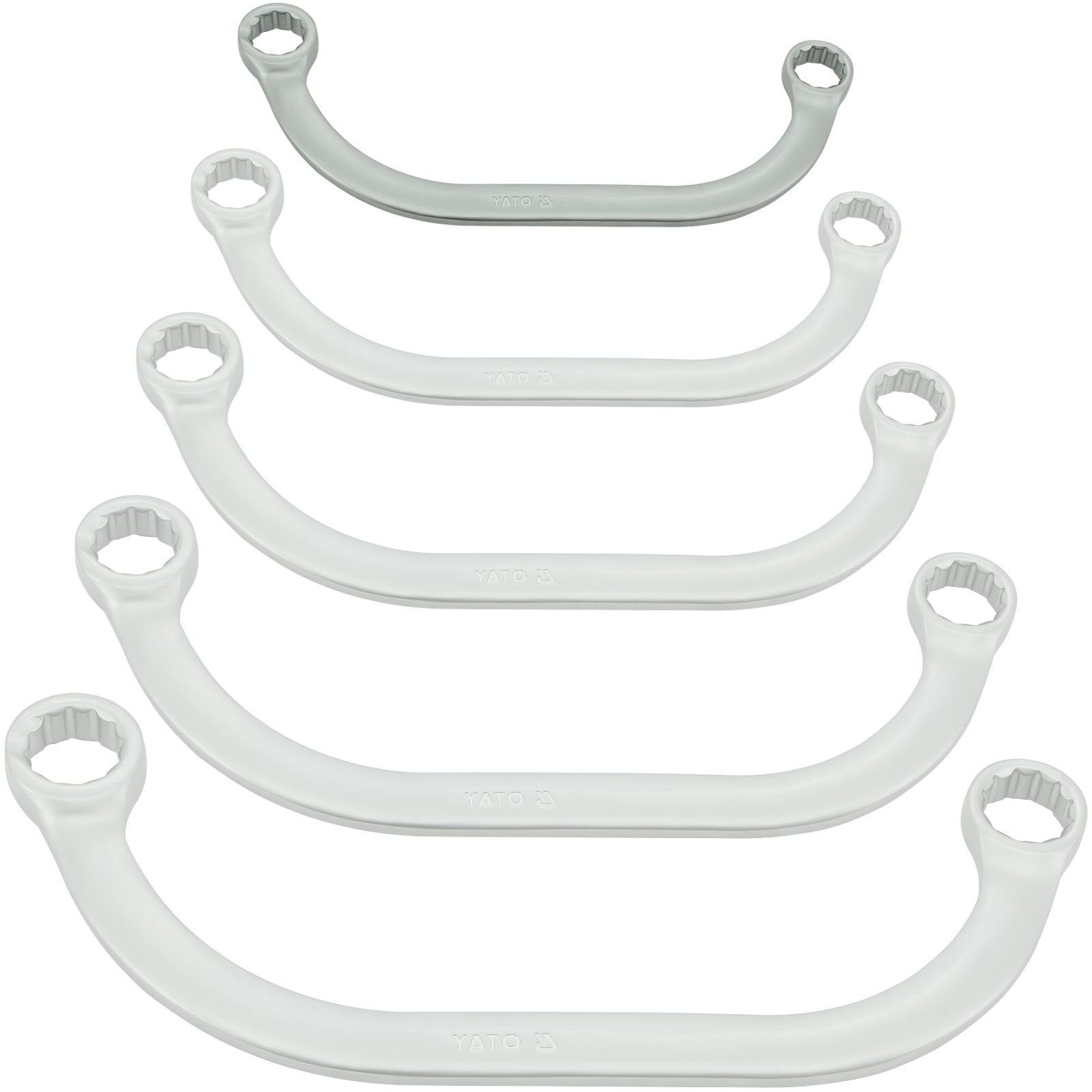 Praktischer Schraubenschlüssel mit bogenförmigem Hebel und dünnen Ringen zum einfachen Anziehen und Lösen von Schrauben und Muttern. Der Ringschlüssel eignet sich ideal für Arbeiten unter beengten Platzverhältnissen, bzw. an schwer erreichbaren Stellen wie z.B. im Kfz-Bereich an Motor, Lichtmaschine, Anlasser uvm..