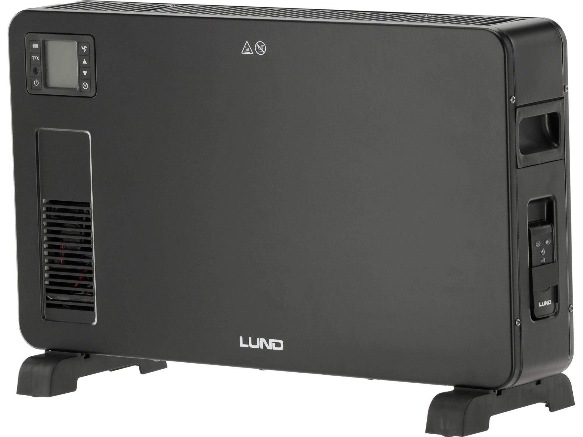 Termoconvettore nero con controllo della temperatura. Funziona in tre livelli di potenza selezionabili: 1000 W, 1300 W o 2300 W, e in modalità antigelo. Grazie al controllo preciso della temperatura, il riscaldamento inizia quando la differenza tra la temperatura ambiente e quella del termoconvettore è superiore a 2 °C. La modalità antigelo accende il termoconvettore quando la temperatura ambiente scende sotto i 5 °C. Il termoconvettore è dotato di un interruttore separato per la ventola. Dispone inoltre di un timer impostabile da 1 a 24 ore.