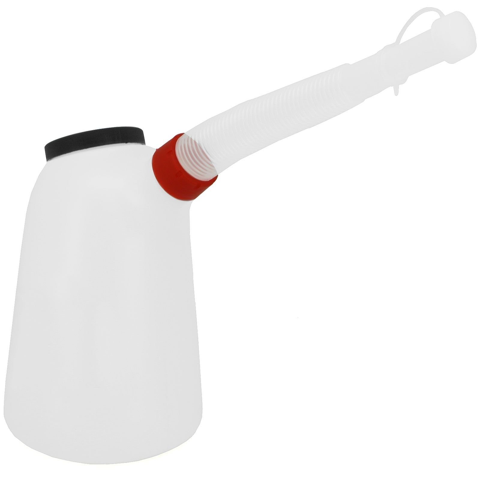 Praktische Füllkanne aus Kunststoff mit flexiblen Einfüllstutzen und 5 Liter Fassungsvermögen. Durch den langen und elastischen Stutzen ideal für schwer erreichbare Stellen wie Öltank oder Wassertank. Eine Skala erleichtert das maßgenaue Einfüllen von Flüssigkeiten wie Motoröl, Bremsflüssigkeit u.a. Betriebsflüssigkeiten. Ein unerlässlicher Helfer in der Garage oder Werkstatt.