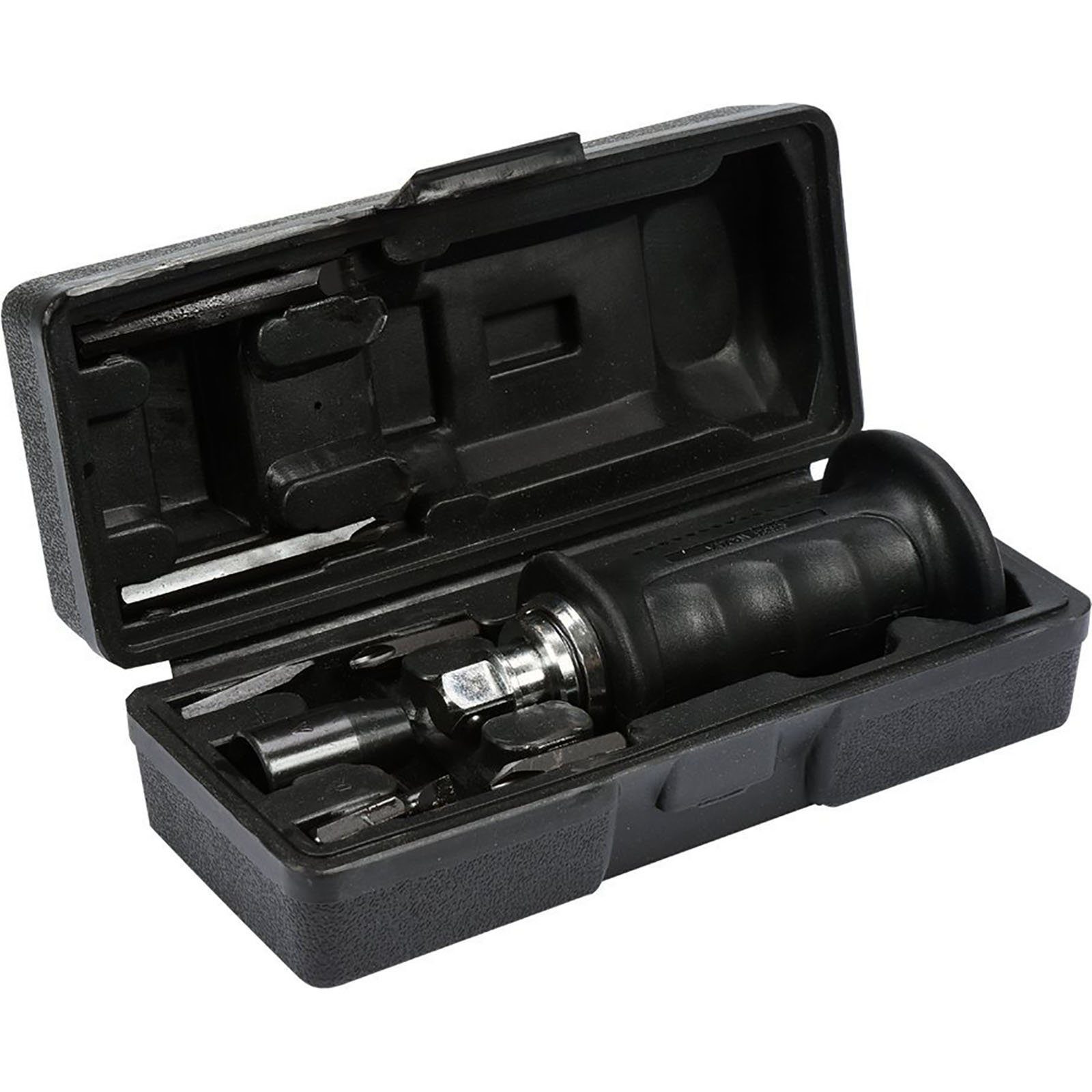 Handlicher YATO-Schlagschrauber mit einem 175 mm langen, ergonomisch geformten Kunststoffgriff und 6 geschwärzten Aufsätzen. Das ideale Werkzeug zum Entfernen und Lösen schwergängiger Schrauben, Bolzen und Muttern. Er funktioniert durch Umwandlung der kinetischen Energie des Hammerschlags in eine Drehbewegung der Schraubendreherspitze. Beim Schlag auf den Schrauber wird die Nuss/der Bit nach links zum Öffnen gedreht.