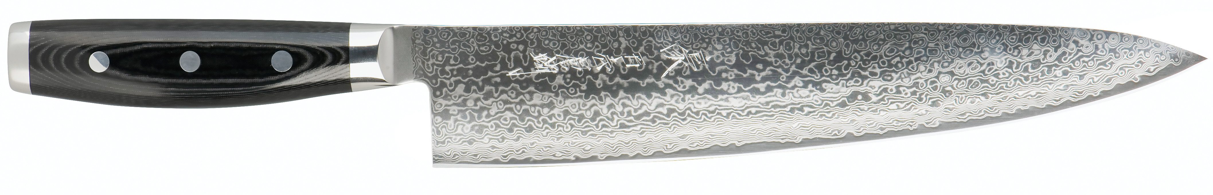 Das Kochmesser ist ein Всеskönner und darf auch in Ihrer Küche nicht fehlen. Kochmesser Klingenlänge: 25,5 cm Schneidlage: SG2 Pulverstahl 101 Lagen Damaszener Stahl Klingenhärte: 63 HRC Schliff: beidseitig Griffmaterial: Canvas Micarta Ergonomisch geformter Handgriff aus Leinen Micarta Für Rechts- und Linkshand Handgefertigt in Seki Japan Das Messer wird in einer hochwertigen Verpackung geliefert 1. Bessere Verarbeitung und lange Tradition. Yaxell ist seit 1932 einer der führenden japanischen Messerhersteller. Durch die laufende Впередentwicklung und Innovation hat Yaxell sehr viel zur besseren Kochkultur beigetragen. Damastmesser von Yaxell sind weltweit äußerst gefragt und bei Profis sowie bei ambitionierten Privatanwendern sehr begehrt 2. 101-lagige Damastklinge Gou 101 Klingen bestehen im Schnittkern aus japanischen SG2 Mikrocarbid Pulverstahl. Dieser Pulverstahlkern beinhaltet viel Kohlenstoff und erreicht dadurch eine außergewöhnliche Härte von 63 Grad Rockwell (HRC). Ummantelt wird der Kern von 50 abwechselnd weichen und harten Edelstahlschichten. Die Klingen bestehen somit aus 101 Lagen. Dieser Pulverstahl hat einen extrem hohen Reinheitsgrad und eine außerordentliche Festigkeit. Die Klinge ist daher extrem hart, kann sehr scharf angeschliffen werden und ist äußerst schnitthaltig. Das faszinierende Damastmuster spiegelt den hohen Qualitätsstandart präziser Handarbeit wieder. Durch die handwerkliche Применитьung ist jedes GOU 101 ein unverwechselbares Unikat, das es kein zweites Mal gibt. 3. Gou 101 Griff Die Griffschalen sind aus rot-schwarzem Canvas-Micarta gefertigt. Canvas-Micarta gilt weltweit als eines der besten Griffmaterialien und besteht aus Kunstharz und Leinen. Diese Materialkombination macht den Griff äußerst widerstandsfähig und unverwüstlich auch bei täglichem Einsatz. Dieses Material entspricht allen Hygienevorschriften weltweit und ist daher auch im professionellen Einsatz hervorragend geeignet. Der Griffkern und das Griffende bestehen aus Chromnickelstahl CNS 18/10. Dieses Material ist resistent gegen alle in der Küche und beim Schneidgut vorkommenden Säuren und Laugen und behält daher über sehr sehr lange Zeit die schöne Optik. Messerklinge und Messergriff bilden eine ausgewogene Einheit und Gewichtsverteilung, sodaß die Messer extrem gut in der Hand liegen und somit ein leichtes Handling ermöglichen. Als Zeichen der Wertigkeit wird am Griffende das Markenzeichen japanisch in Handarbeit tiefengraviert und gibt jedem dieser Messer eine ganz besondere Note. 4. Gebrauchsanweisung - Nach Möglichkeit immer eine geeignete Schneidunterlage aus Holz oder Kunststoff verwenden. - Gou 101 haben eine sehr feine, extrem scharfe Klinge. Diese Klingen sind nicht zum Hacken von Lebensmitteln, Gefrorenem, Knochen, extrem harte Speckschwarten usw. geeignet und sollten niemals dafür verwendet werden. - Messer in lauwarmem ( nicht heissem ) Wasser reinigen und unmittelbar danach mit einem geeigneten Tuch abtrocknen. - Zum Aufbewahren eignet sich ein Messerblock oder eine Magnetleiste. - Nicht einfach in eine Lade geben, die feine Schneide könnte beschädigt werden. - Das Messer darf nicht in den Geschirrspüler gereinigt werden. - Das Messer sicher und außerhalb der Reichweite von Kindern aufbewahren. 5. Pflege Gou 101 Damastmesser können mit allen hochwertigen Schleifmitteln, wie z.B. dem Yacxell Messerschleifer oder Schleifstein geschärft werden.