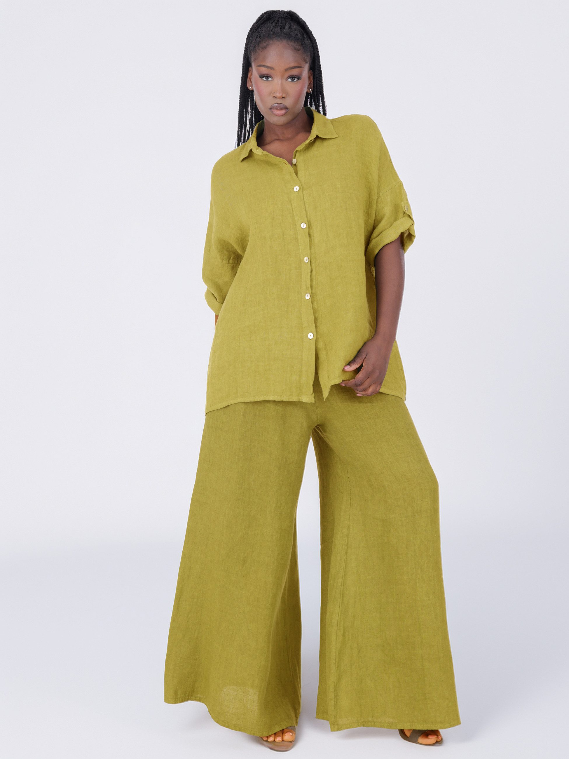 Weite Leinenhose mit extra hohem, gesmoktem Bund