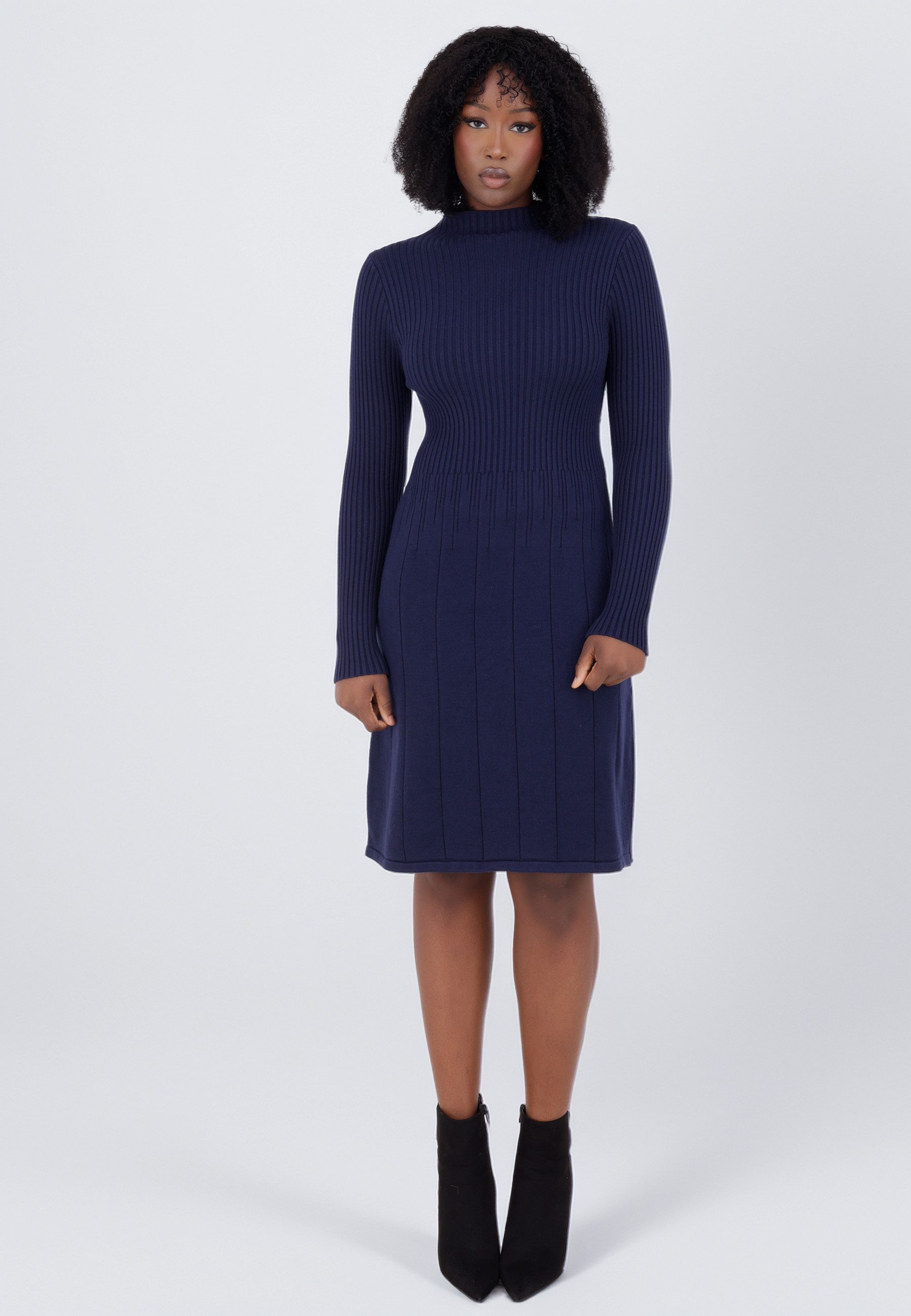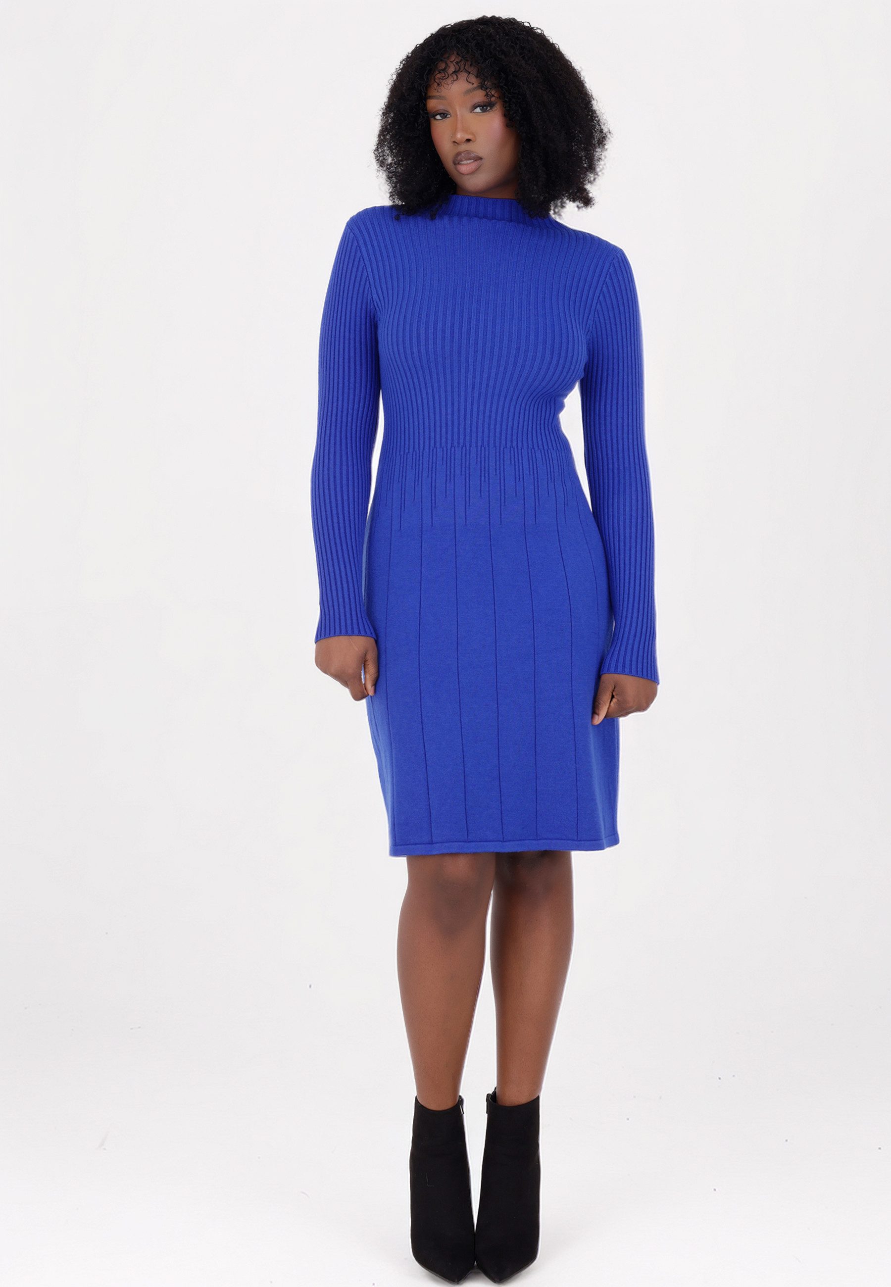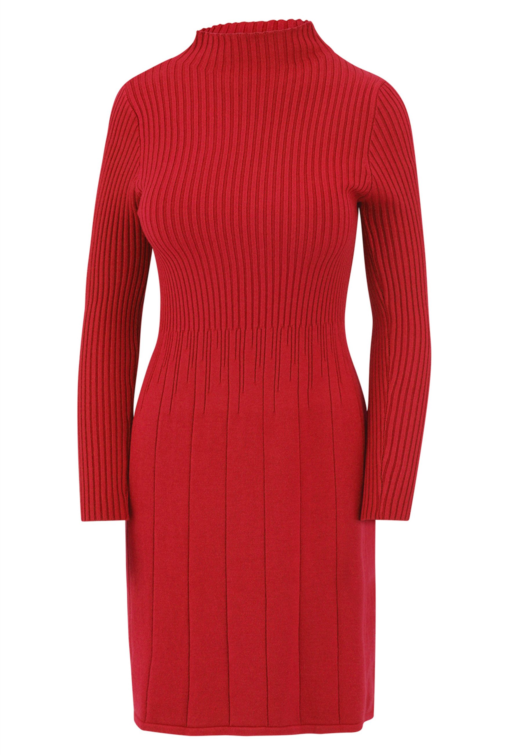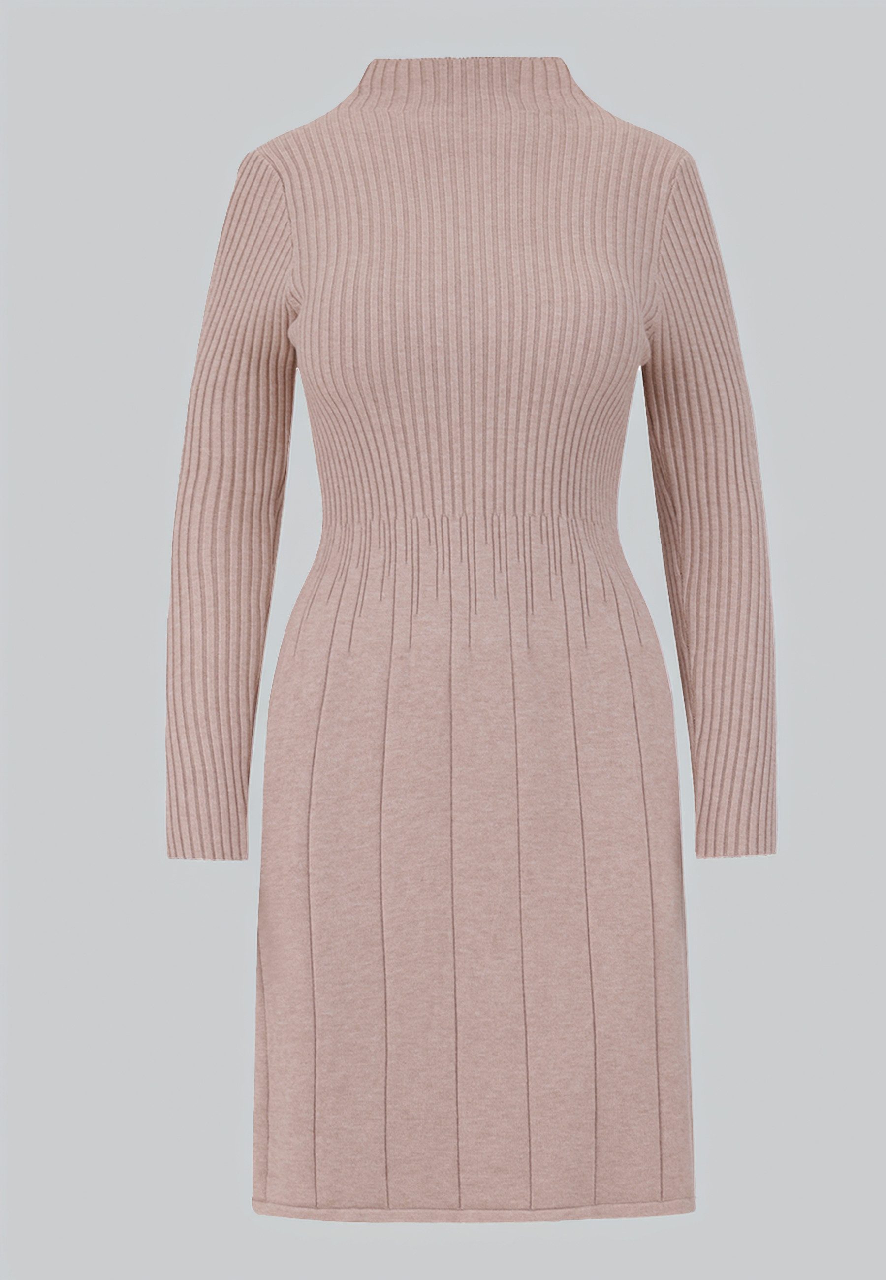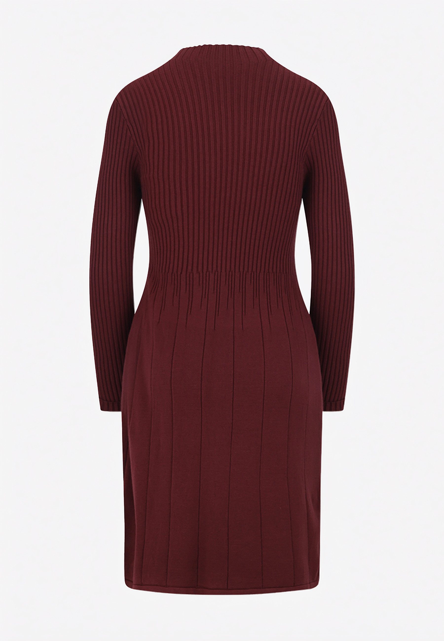 Der hochgeschlossene Stehkragen verleiht dem Kleid eine elegante Note, während die langen Ärmel für angenehme Wärme sorgen. Das Strickmaterial ist weich, dehnbar und formstabil, sodass es bequem sitzt und gleichzeitig stilvoll aussieht.