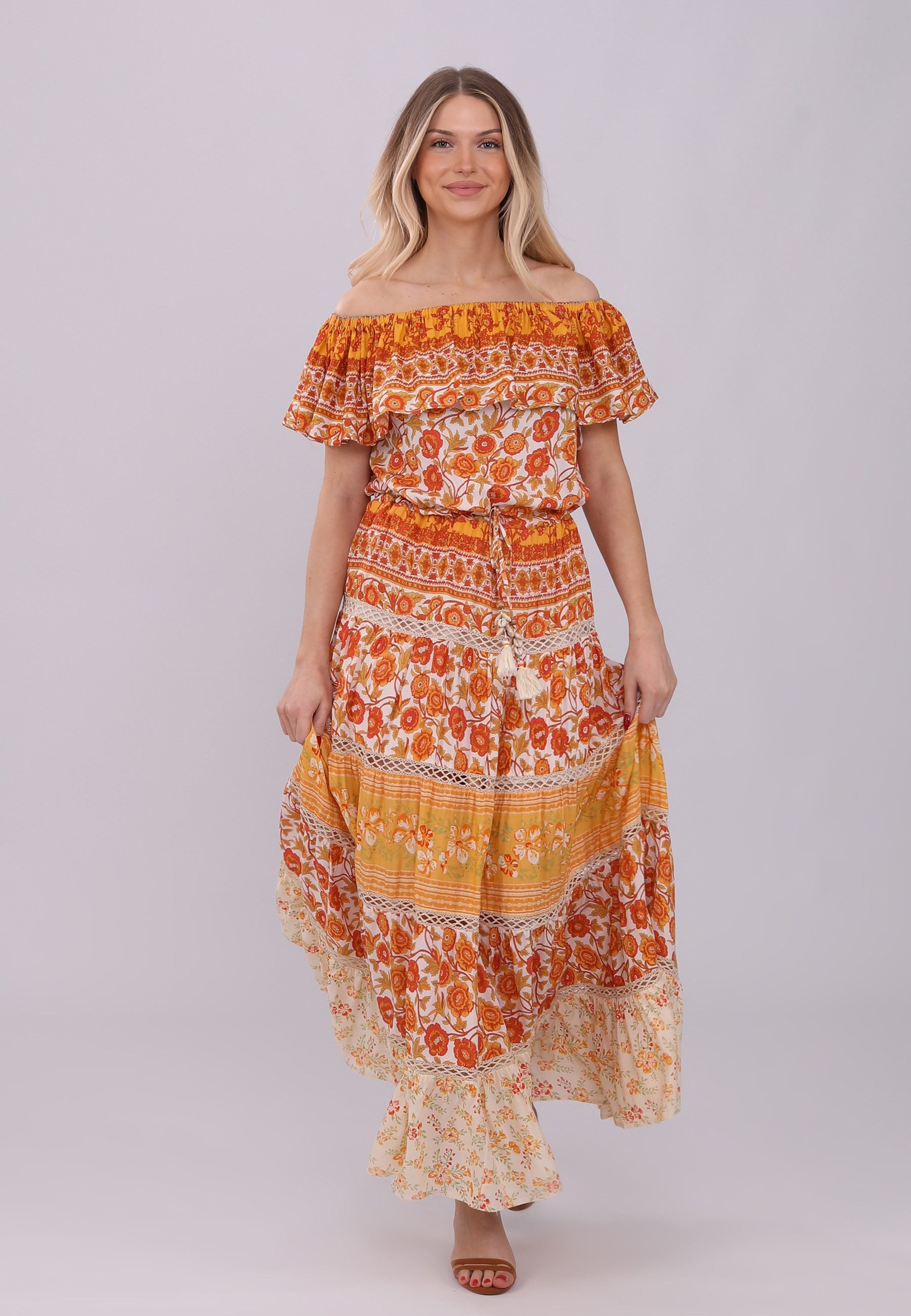 "Boho-Charme" Carmen-Kleid mit Blumenprint ist der Sommerhit, der in keinem Kleiderschrank fehlen darf. Eleganz trifft auf Komfort, Stil begegnet Lässigkeit – holen Sie sich Ihren Sommerglücksmoment.